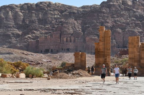 We were up early and met Nashat at 7 am at the breakfast buffet in the hotel. We were soon at the entrance to Petra and on our way in to take a look at the magnificent place in the daylight. Though early, it was already hot. The day before, in our discussions of today’s itinerary, Nashat explained to us that our stop at Petra would be brief. We had to make a drive to Wadi Rum before evening. We thought he said something about being done at Petra by noon. So when we arrived we hit the ground running.