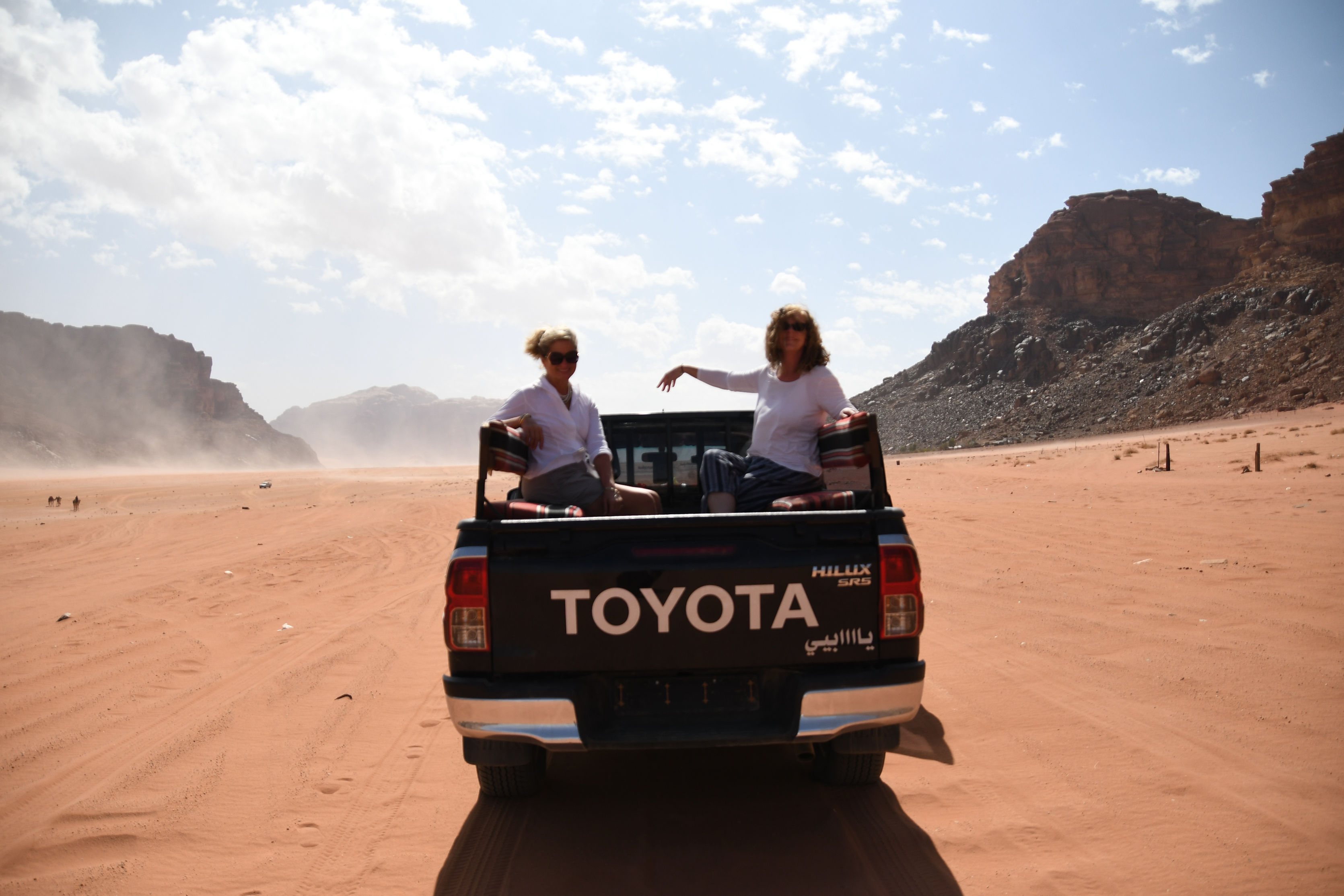 Abdullah picked us up in his truck and explained that we would start in the cab, but then we would switch to the benches in the back of the truck once we got out to the desert. First we stopped in the village of Wadi Rum, which reminded me a lot of a poor, small town anywhere. Then we hopped in the back and sped off into the desert. I’m not sure if all the Wadi Rum guides drive like Abdullah, but he seriously tore through the sand like a maniac. It was very entertaining. At one point he opened the door and stood up outside the cab while he was still driving! We caught air while leaping over sand dunes. Our hair was blowing in every direction and then the winds picked up and we got sandblasted. Margaret soon had to move back into the cab because the blowing sand was irritating her contact lenses.