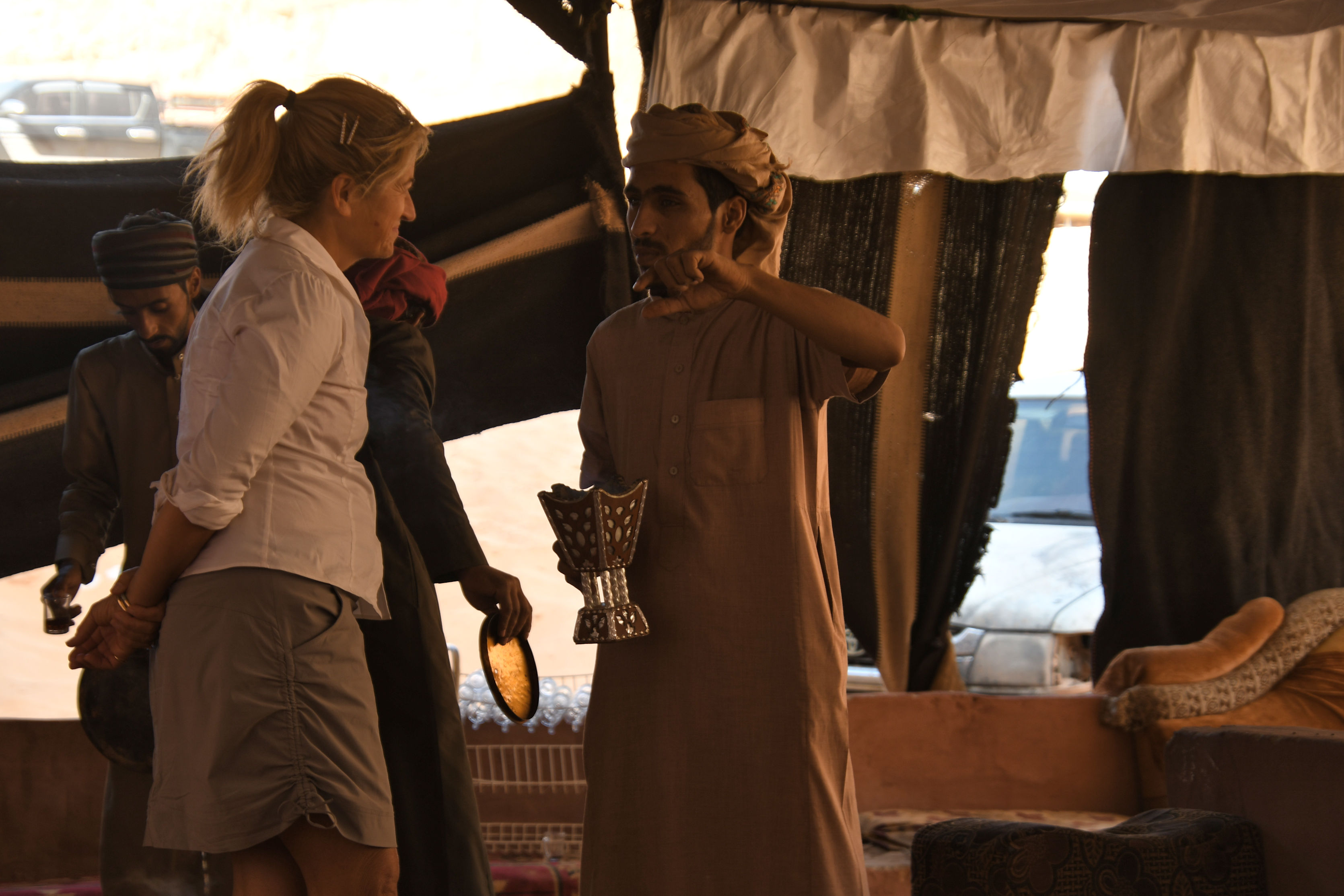 We were going to meet Abdullah again, the young Bedouin man who showed us the way to our camp yesterday. He would be giving us a tour of the desert, but not until noon. There was some sketchy internet access and some outlets in the center of camp, so after breakfast I sat there for 3 solid hours and edited photos and wrote for my next blog post. I kept trying to update Word Press, but I couldn’t do the whole thing at once. I had to try twice to get all the photos uploaded – the first time the internet went out before all the images were uploaded. The third time the internet came back, I uploaded the text I had written in Word. The fourth time the internet came up, I edited the words and images and polished the post. I finally got it published, and when I confirmed that I had successfully published a post after two hours, I threw my arms in the air in a victory sign! Then I noticed I had not included the answer to the IKEA quiz, but I no longer had internet, so I fixed it the next day. When there was no internet, I either wrote or edited photos. I’ve been taking about 400 photos a day, and that’s a lot to dig through in order to choose the best ones for the blog.