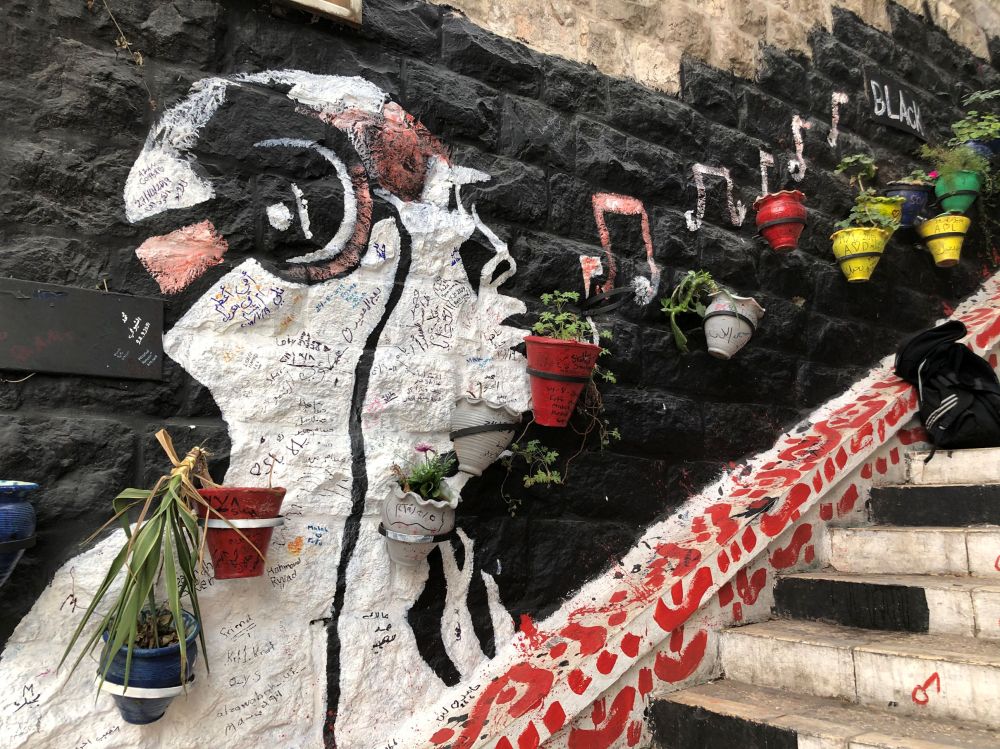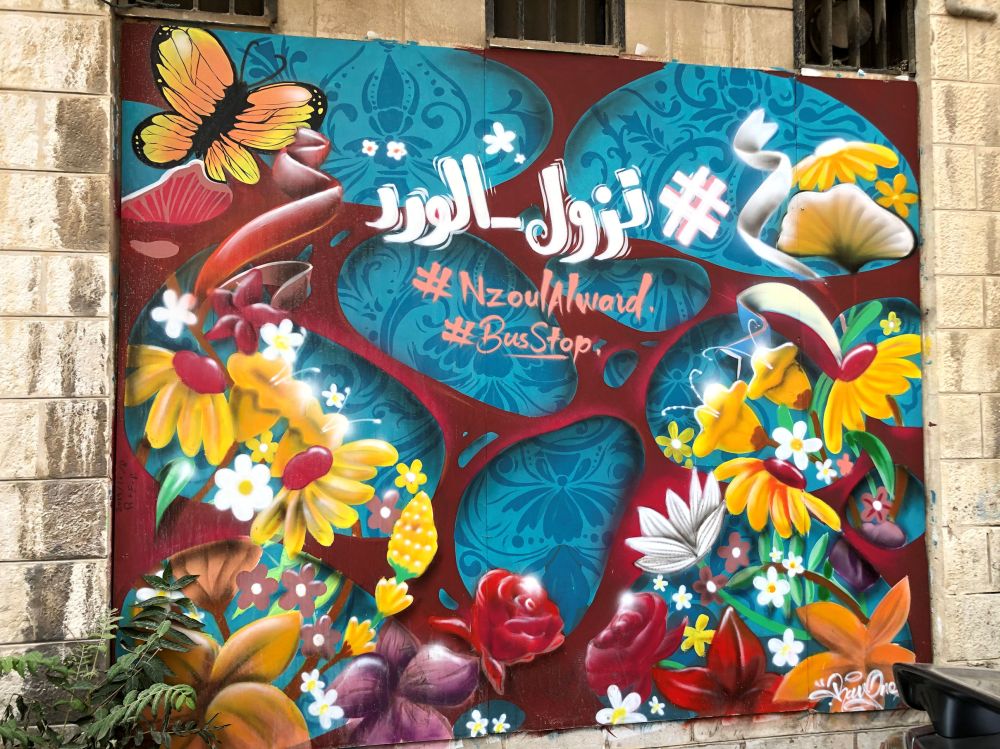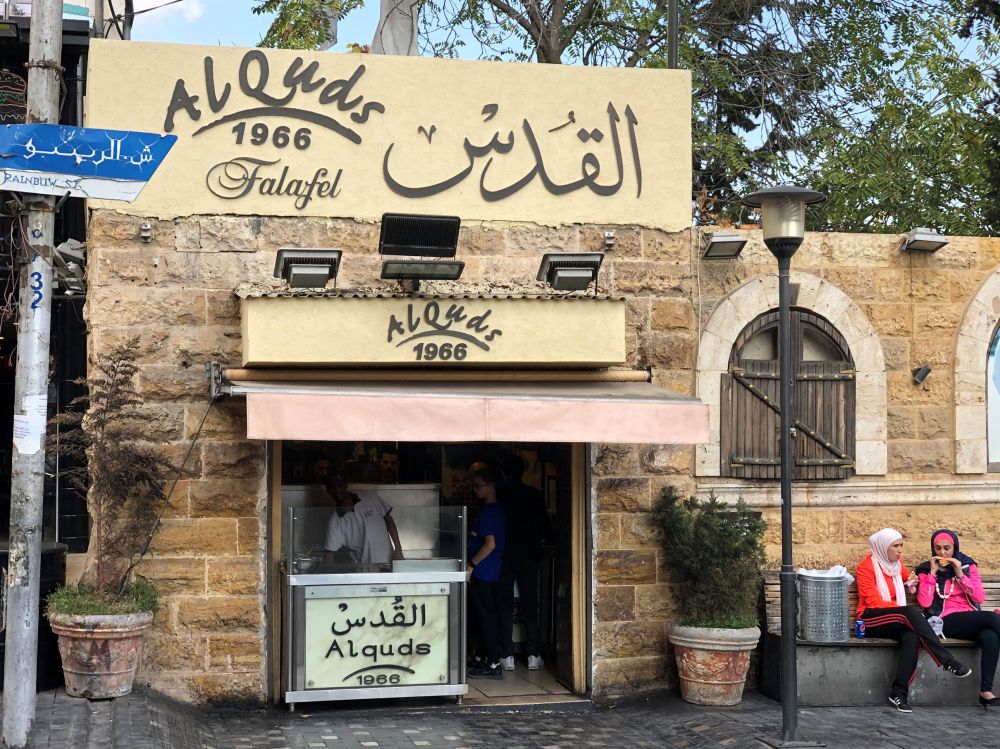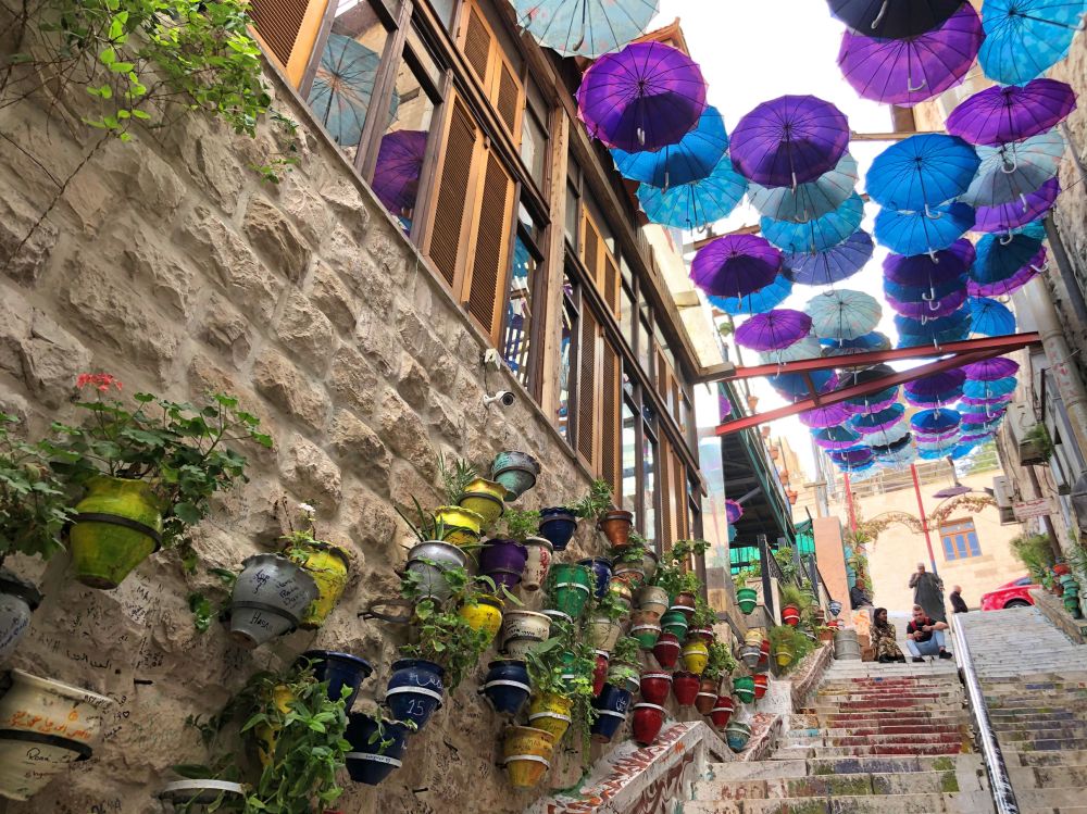 Margaret recalled from earlier in the trip that we had seen a set of stairs with colourful umbrellas and asked Ezat if we could go there. We parked nearby and we walked through the city streets to find it. On the way we did more shopping and I marveled at the idea that I was in the capital city of another country. Again and again, I feel so fortunate to have such a wonderful life. We stopped for falafel at a place Ezat told us was King Abdullah II’s favourite place for falafel. Margaret and I already knew we liked falafel, so a stop at Al Quds was an easy choice. It was a tiny shop, people were super crammed in, and food came out efficiently and deliciously.