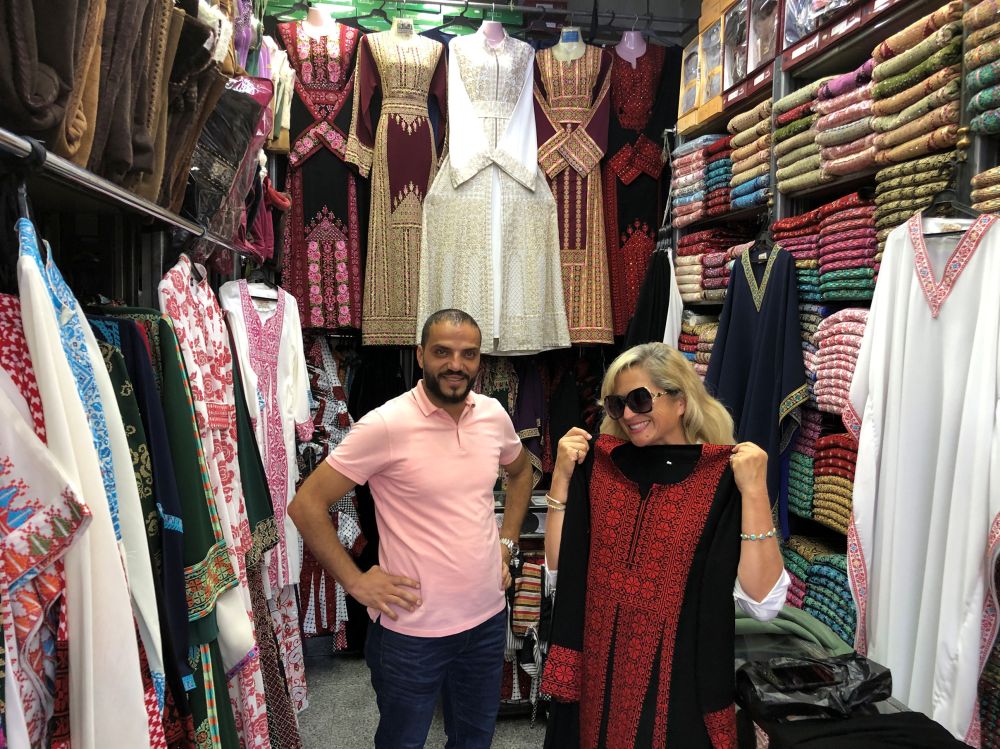 Out on the street, a couple of women stopped Margaret and asked to get selfies with her. Margaret told us this had already happened once or twice in Jordan, but I hadn’t seen it because they are after her, not me. But when we travel, people just can’t resist Margaret’s great California Girl look! I was happy to hide behind Ezat and let her glam up the selfies. We were near a shop where one of Ezat’s cousins worked, so we went there next. It is a whole section of town with gold shops. Maybe twenty different shops, side by side, selling gold jewelry. Margaret negotiated for a little while to get a ring, but eventually didn’t buy it. Of course we were served tea while we were there, and we had a lot of fun joking around with Ezat’s cousin and the other guy working there. He told Margaret she had beautiful eyes, and again, our Cali girl was Queen of the day. She beamed with pleasure and it was so great to watch her shine. I was tired of attention. Ever since Wadi Rum, Abdullah the guide had been begging me to marry him via facebook messenger. I got three marriage proposals while in Jordan. I sure wish I had this effect on American men!