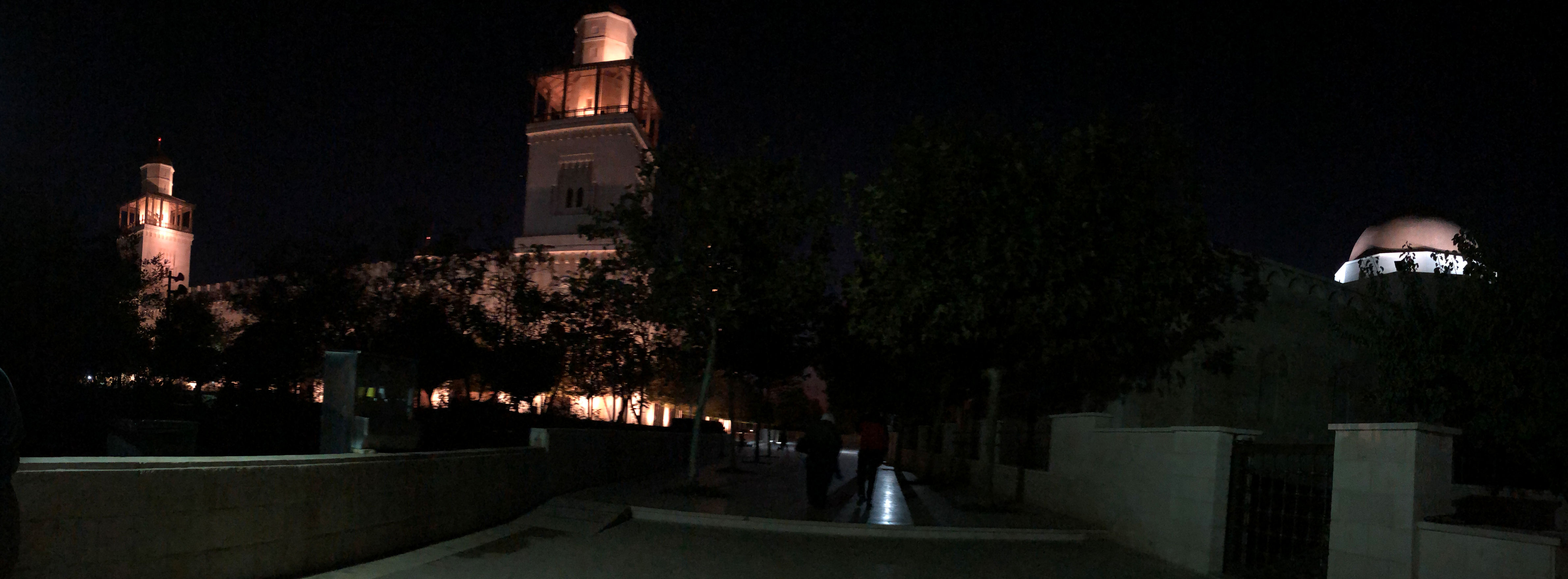 It was dark by this time and we decided to visit the King Abdullah Mosque. We dutifully wrapped up our heads and made our way there, to a park-like area on top of a hill. We walked up to the gate and were denied entrance. We were astonished, since all the websites said that tourists were allowed in. The guard said absolutely not. He explained that the King no longer allows non-Muslims on the premises. Ezat argued long and persistently (though politely because he’s a super sweetheart), but there was no ground given. The guard even told Ezat that while he is Jordanian, as a Mormon he is not allowed to visit the mosque. We asked for permission to photograph it from a distance, and were granted that.