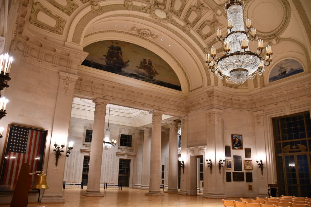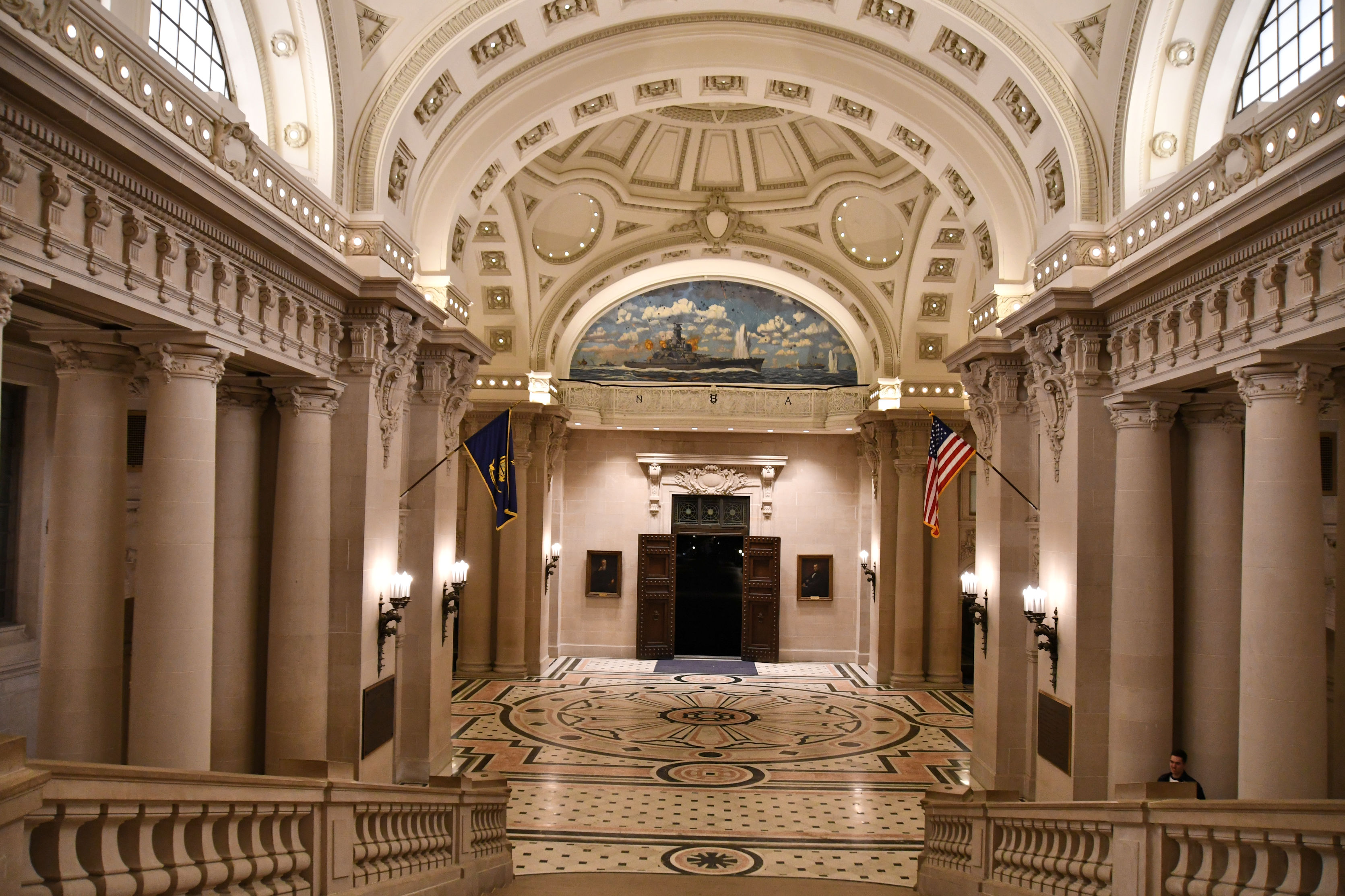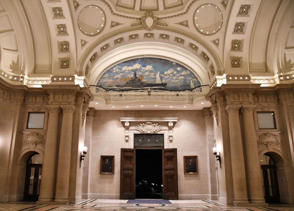 After our questions were answered by the enthusiastic docent, who allowed us to stay well past 5pm as he answered our questions, we were escorted out the door and we continued our exploration of the base. We stood outside and remarked about how huge Bancroft Hall is. Indeed, it is the largest dormitory in the United States. As we watched midshipmen go in and out, we wondered whether or not we were allowed to go inside. Will thought we were, so we went up the steps and were astonished as its magnificence. Can you imagine living in this dormitory while you attended school? I’m not sure I can.