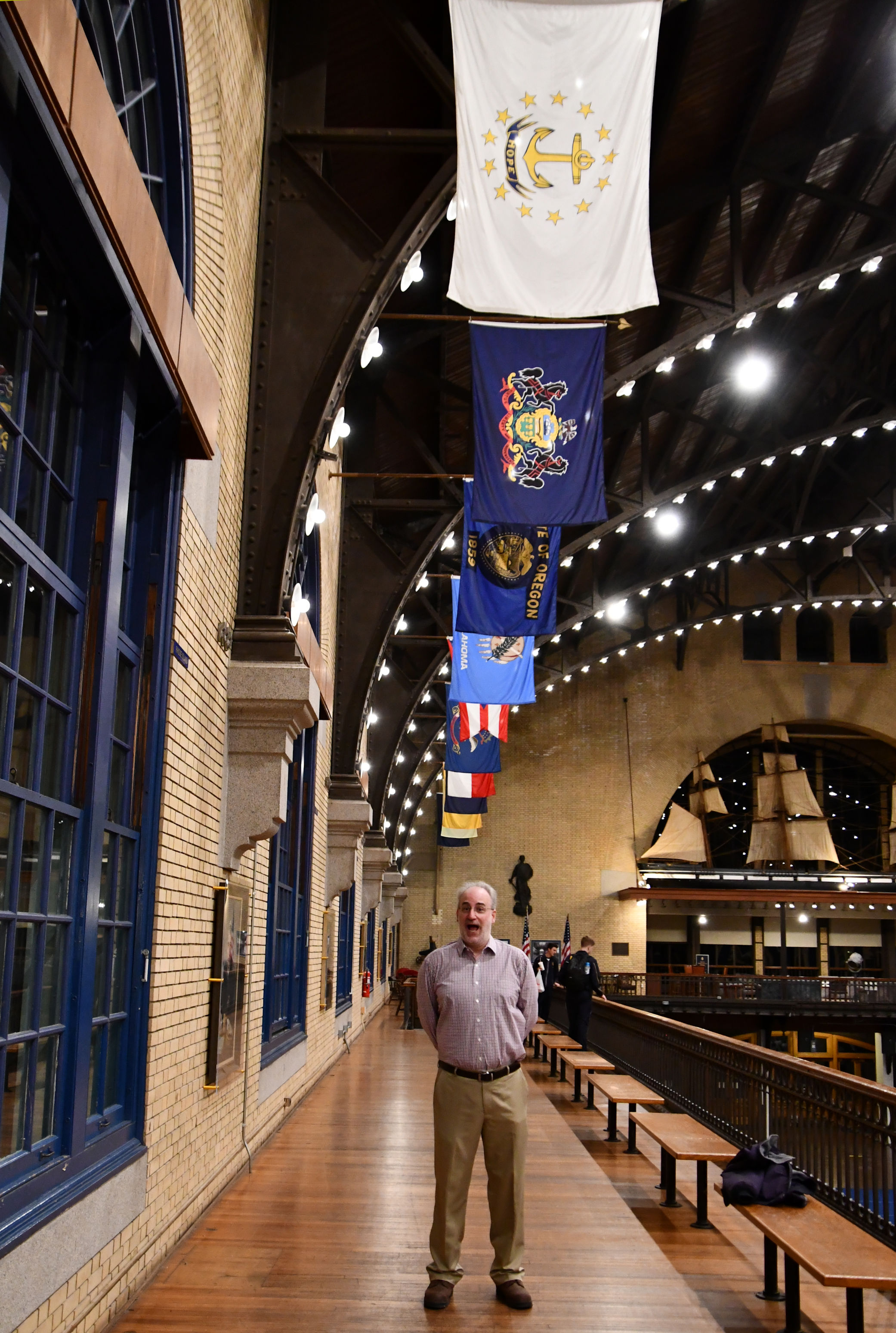 We made one last stop at Dahlgren Hall on our way out. It is a gorgeous old building. The last time I was in here in September, there was a swing dancing class in session. This time there were three groups: the cheering squad and the complimentary jumping-twirling team that assists the cheerleaders. What are they called? And finally a fencing team at practice. We admired the architecture and antiques, Will got his photo beneath the Rhode Island flag, and then we walked back off base.