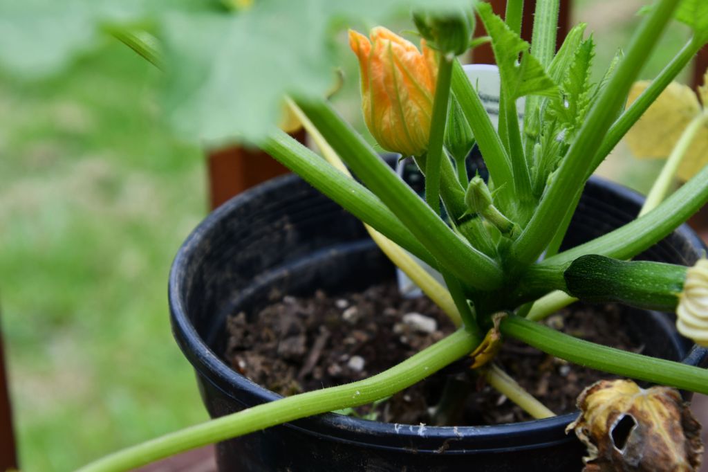 This zucchini is already producing for me, so I need to find a bigger pot.