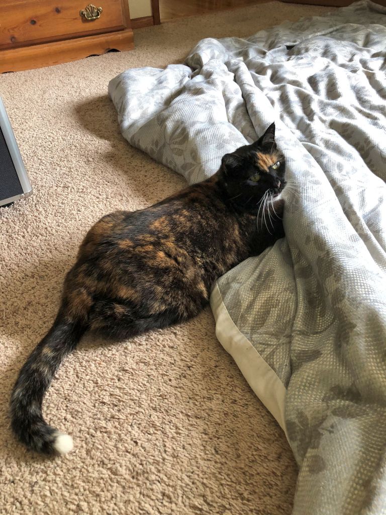 I’ve been leaving the house more often than I have since early March. Racecar prefers that I remain home at all times, since she’s convinced that my purpose here on Earth is to serve her. I’m still going on my weekly hikes with Dan, and visiting, and I spent an overnight in Seattle helping friends move. So when I’m home, kitty is a bit clingy for attention.