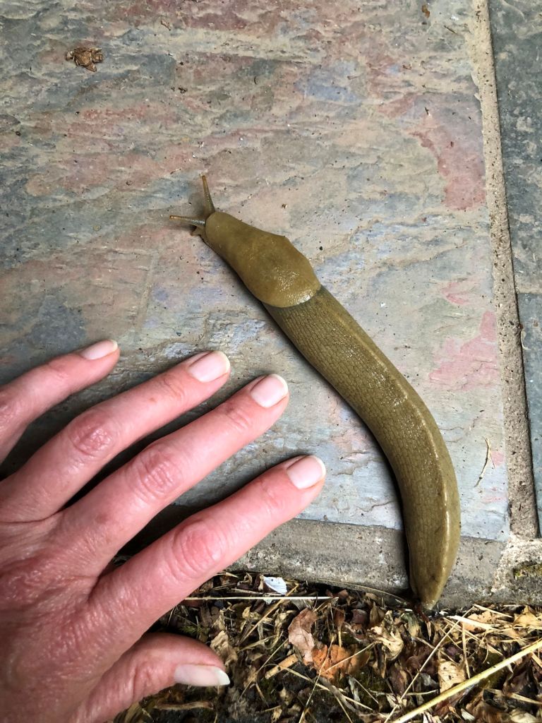 For a parting shot, I’ll leave you with this monster who made his determined way onto my front porch. I put my hand on the ground beside him to show you how huge the slug is. I watched him for a couple hours till he slid over to the house and up the wall. I’m ok with all of his plans as long as he remains out of doors.