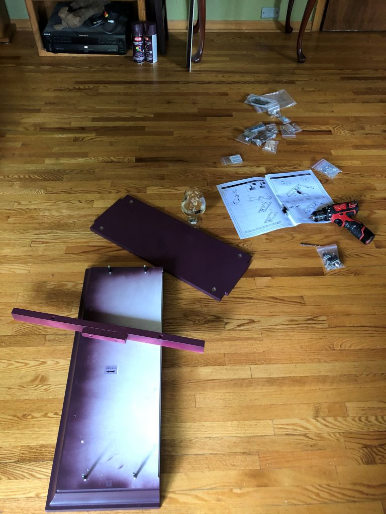 I purchased an over-the-toilet cabinet to expand the storage capacity in my tiny master bath. When I finally found a style I liked, I had to change the colour. I did not like the glossy white. So I found a spraypaint called Eggplant that I loved, and began painting all the pieces before I put it together. Then I ran out of paint and the store was out too. I purchased some cans online and Tara found some of the same paint in Corvallis, and brought up a few when they came to visit. I had six brand new cans of spraypaint. Every single one of them was the same shade exactly…and every single one of the new cans was a distinctly different shade than the colour I began with. Tara and Brynnen were suspicious that I was imagining the difference, but I have an artist’s eye and I think the colour difference is obvious and annoying. I didn’t have faith that purchasing even more paint would fix the problem, so I made do with the too-red shade of purple, and painted the rest. Luckily, I had covered most of the outside surfaces in the colour I like, and the bathroom is dark…