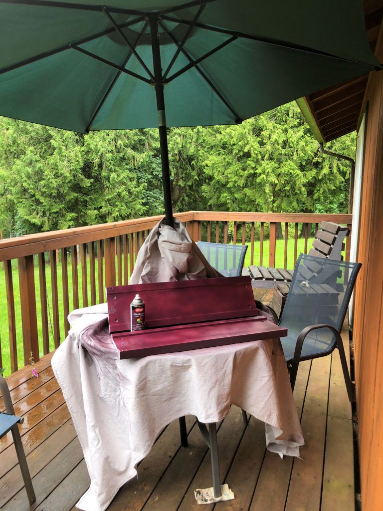 The two larger pieces were painted in the original colour of eggplant that I like. The small piece is in the new paint, labeled the same, but too red and doesn’t match.