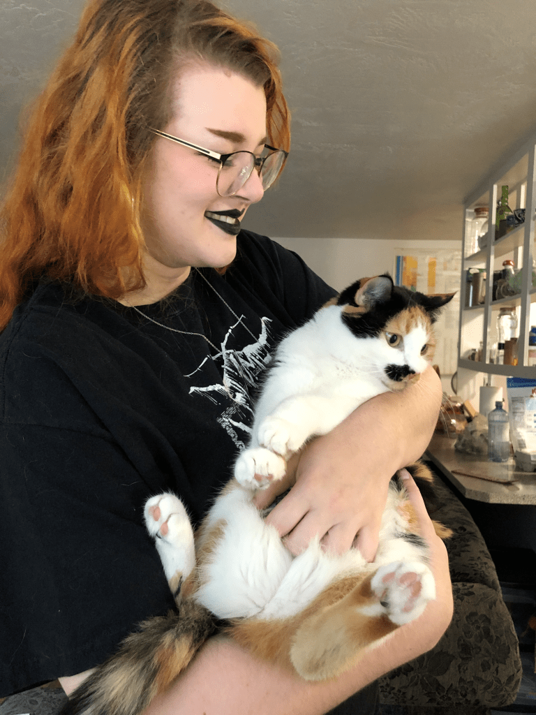 Tara with their kitty, Kenma.