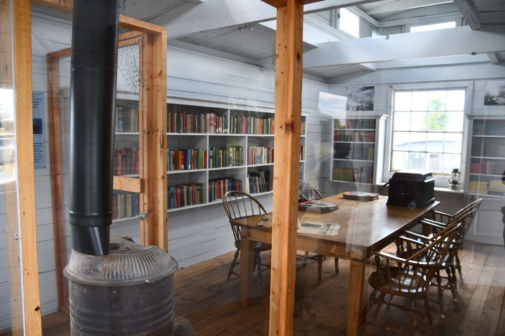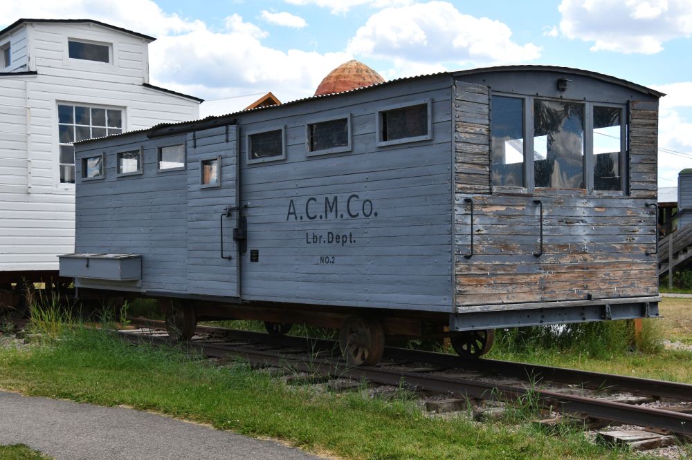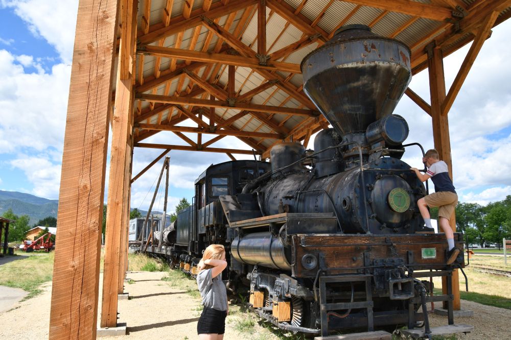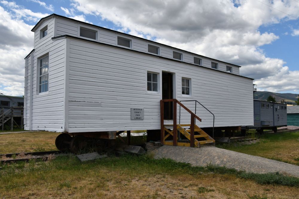 There is interesting railroad history at the museum grounds. We were often able to explore inside buildings and railcars without other visitors, but when we did share spaces, we put our masks on. We saw a car called a “crummy,” for hauling workers into the woods for logging. It was self-propelled, could go either direction, and could climb a 6% grade. This one was built to haul 45 men. I can see why they called it crummy. We walked inside a restored library car for loggers from the 1920s-50s, set up with shelves of books, a reading table, a wood stove, and a check out counter for the librarian. Then we walked through a building that was the old Drummond train depot, with a great little ticket office filled with period-appropriate furnishings, complete with stereotypical Plains Indian calendar. There was a model train inside a glass case, that serviced imagined logging operations.