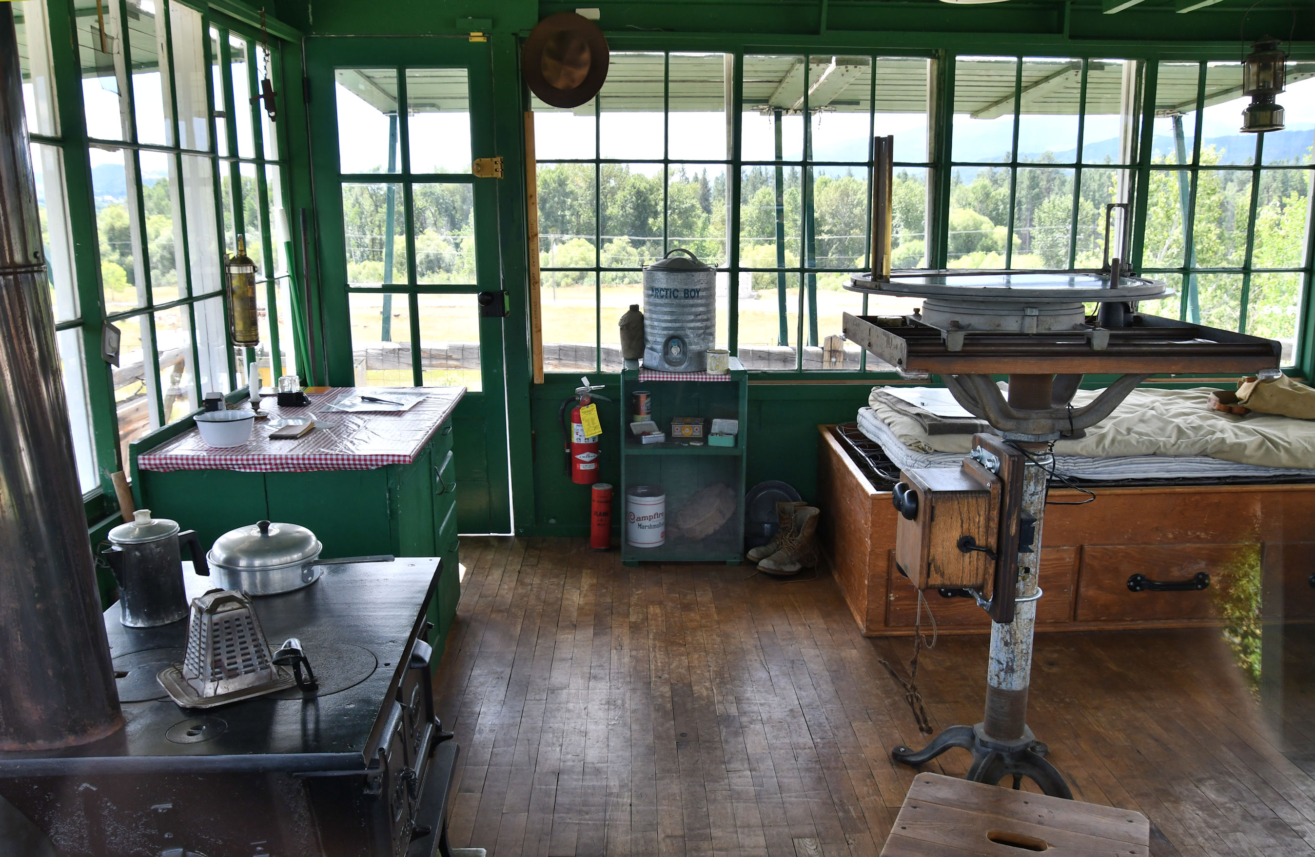 Finally we explored an old U.S. Forest Service fire lookout tower. These lookouts are scattered all over the Western United States and were popular in the early 1900s to keep a set of human eyes on the forests, providing an early warning system to identify wildfires. Today, only a fraction of these towers are used as active early warning sites. Most have fallen into disrepair, and some are maintained and rented out to wilderness adventurers who are willing to hike to them and stay a few nights. The museum lookout is set up as though it might have been during the heyday of tower use. As a person with her own U.S. Forest Service china collection, I enjoy seeing bits of it in other places. It’s hard for me to imagine my government investing in something like a line of branded china.