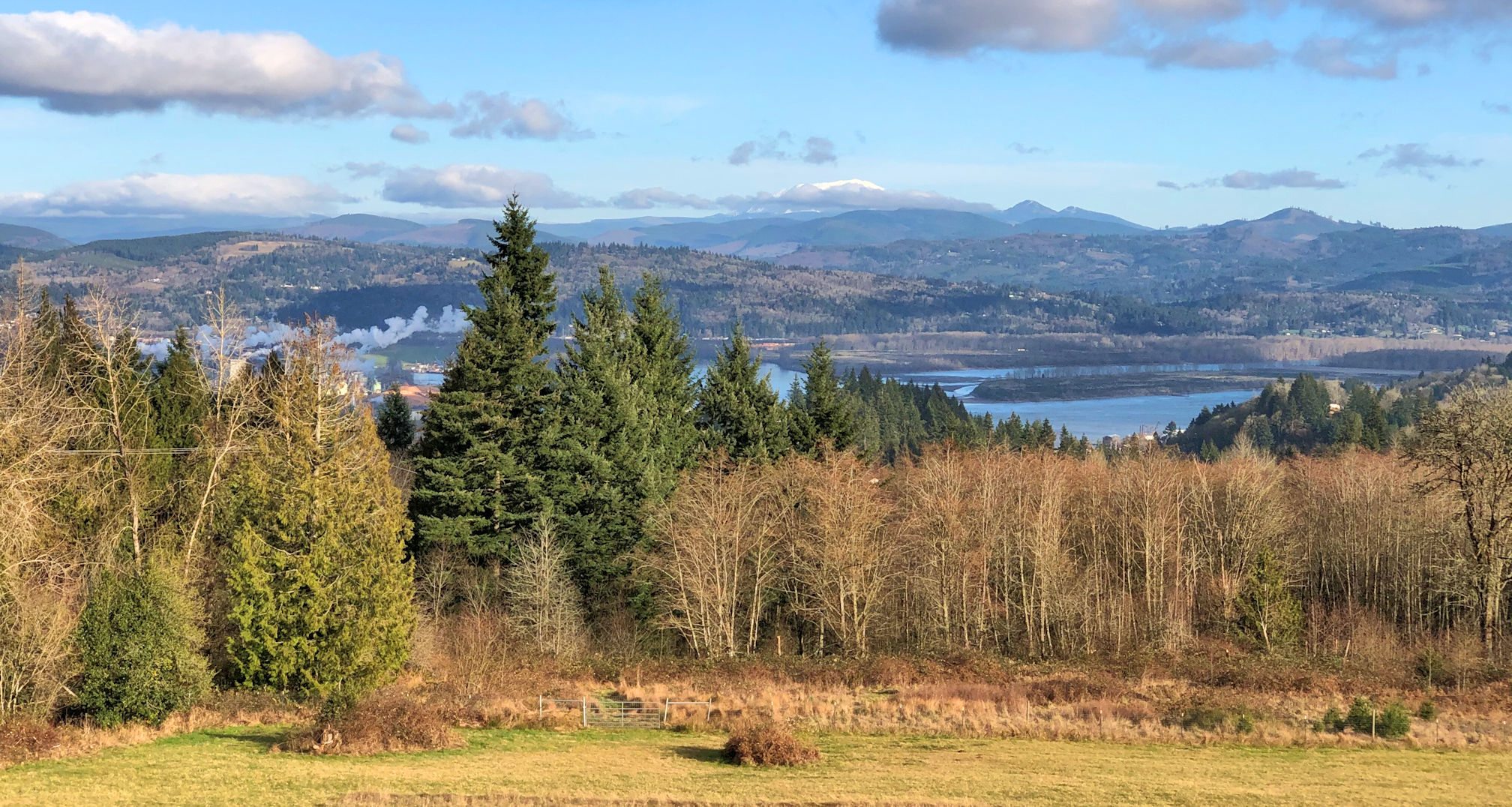 A view in my neighborhood a couple of days ago. I am standing in Oregon, looking across the Columbia River to the state of Washington. The steam billowing up on the left is from the Port of Longview, in Washington state, and the flat, white top of active volcano Mt. St. Helens is barely peeking above the clouds, top center.