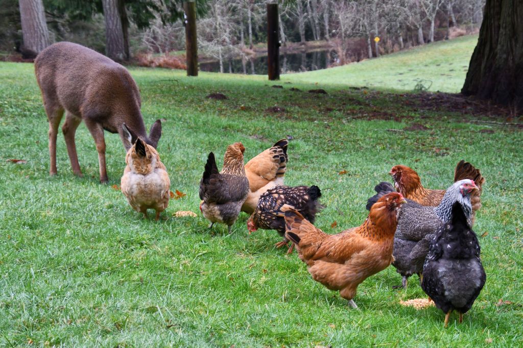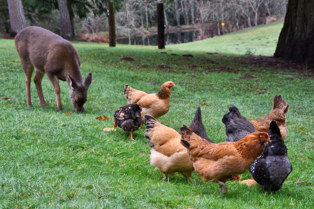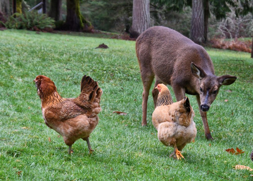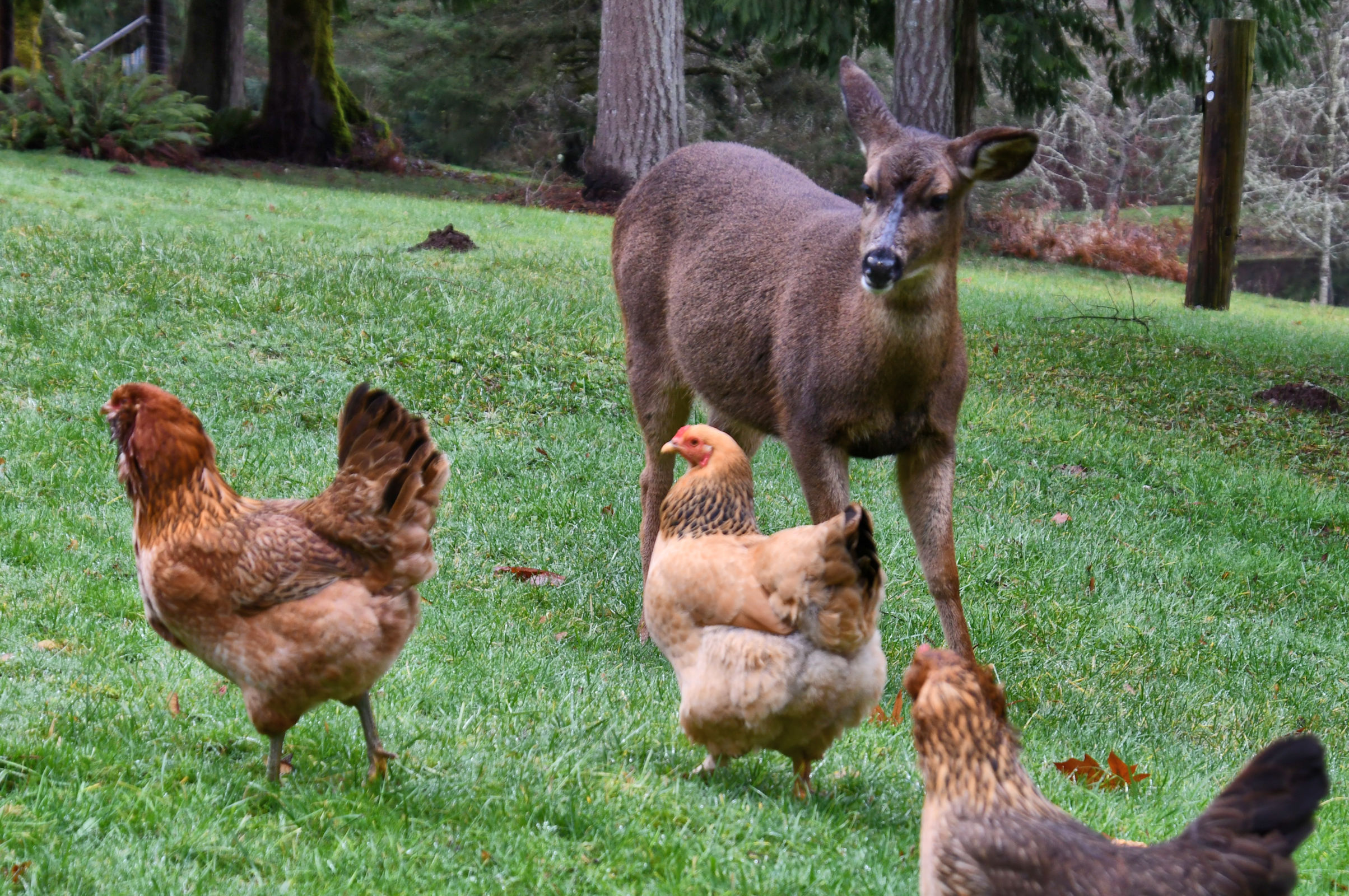 I think this is the first time a deer has met my chickens close up. I recently discovered when I leave their door open, this particular group of hens doesn’t go far. In the past, I’ve had the Hussies, who roamed far and wide and brought shame on our family name. But in this group, there’s only one of that original bunch, and their dynamic is different. These 8 ladies prefer to hang around home. And their reward for that is that I’ve been leaving the door to their pen open nearly every day. They roam around, eat grass and bugs, and then go home at the end of the day. The deer come through the yard a couple times a day but there has never been a reason for them to meet each other until today.