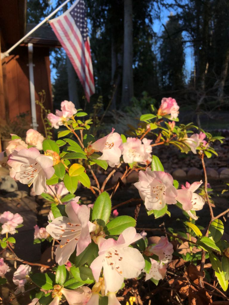 A year ago, sunset lit up the early-blossoming rhododendrons in the front of the house. The season is late this year. The same plant currently has one open blossom – maybe two weeks behind looking like it does in this photo. My faded US flag has also been replaced. I feel that it’s disrespectful to display the flag once it’s getting battered. This is also addressed in [USC02] 4 USC Ch. 1: THE FLAG (house.gov). I’ll admit I don’t follow all the rules, however. I fly the flag at night, and in rain. If I could only hoist my flag on dry days, it would only fly 27 days a year here!!