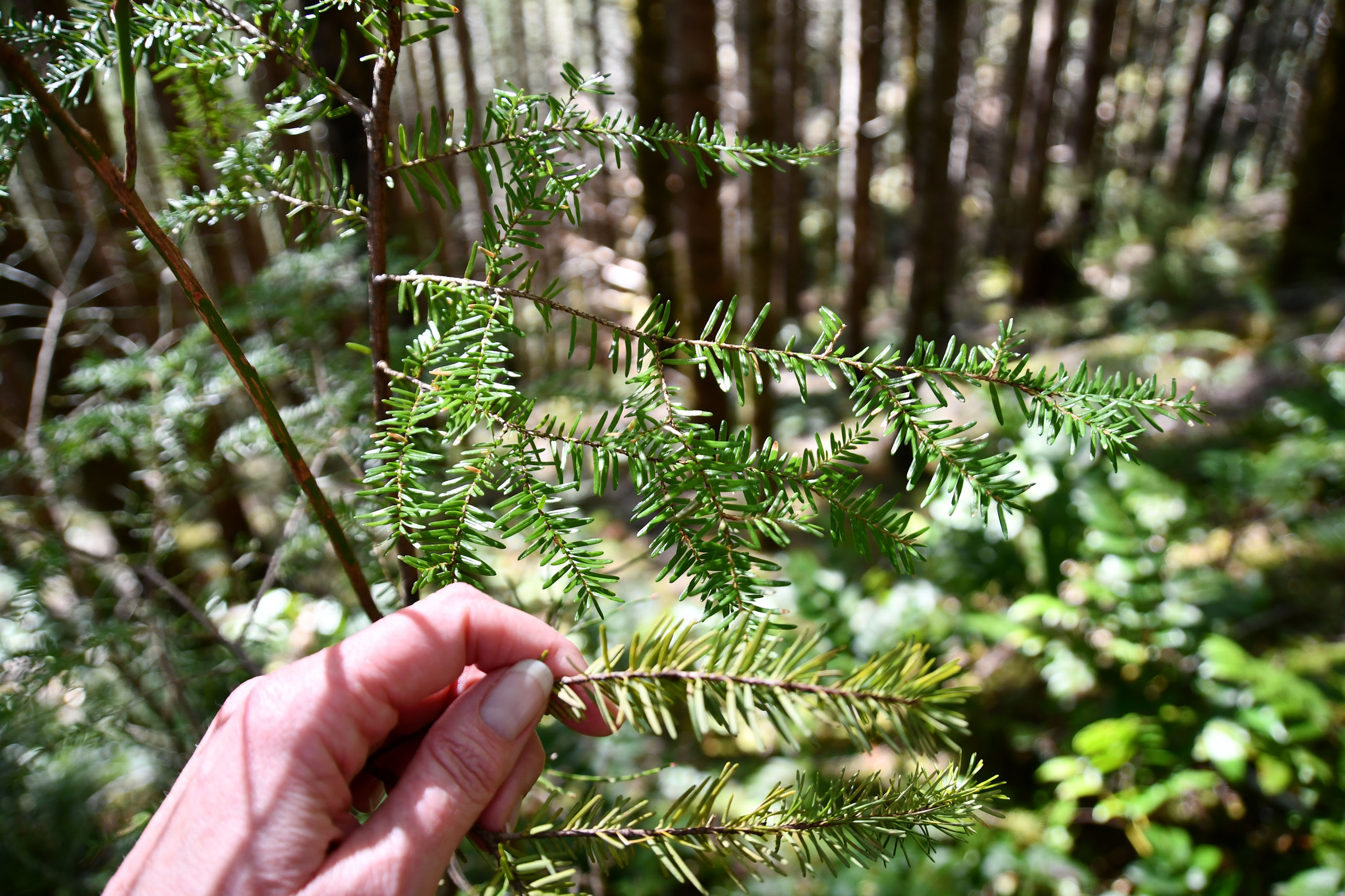 Here I am trying to identify the top tree branch by comparing to the one in my hand. It looks like a redwood, but this area isn’t known for redwoods. The area is instead famous for Douglas Fir, which is what I think I have in my hand. Needles (leaves) on the unknown tree are flat, instead of a bottlebrush spray around the branch. And there are more joints to the branches than the long straight pieces in my hand.
