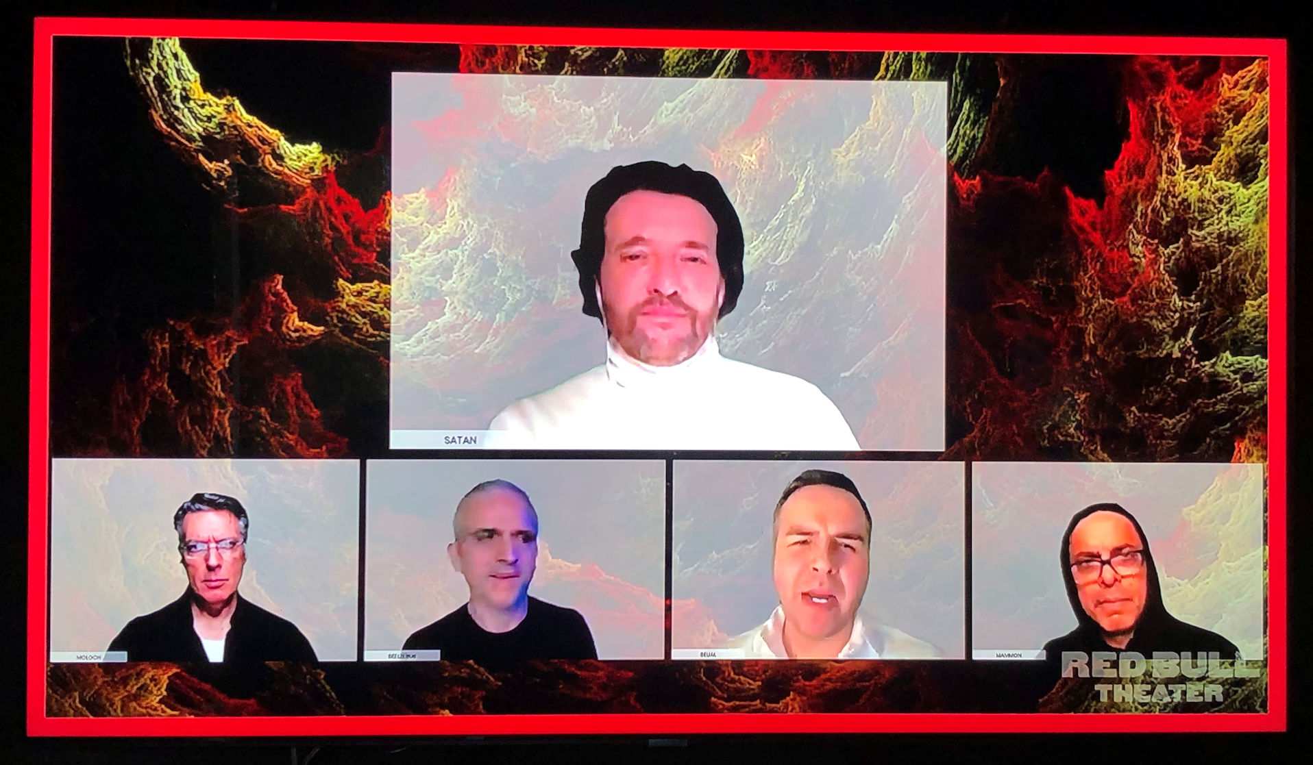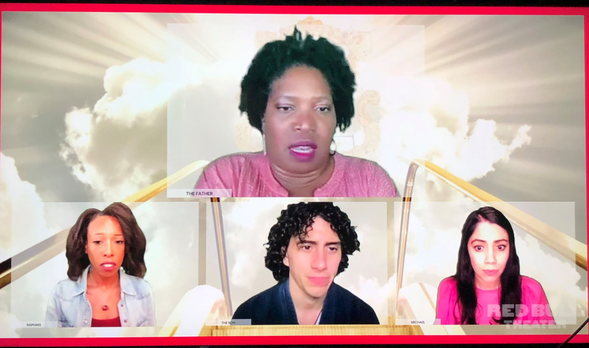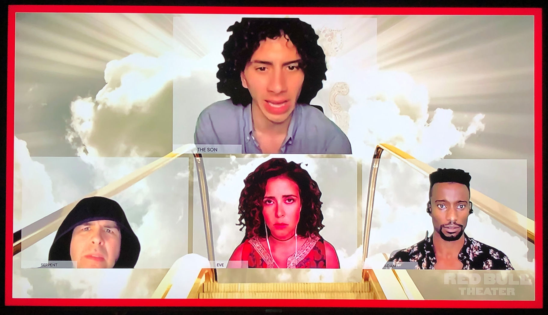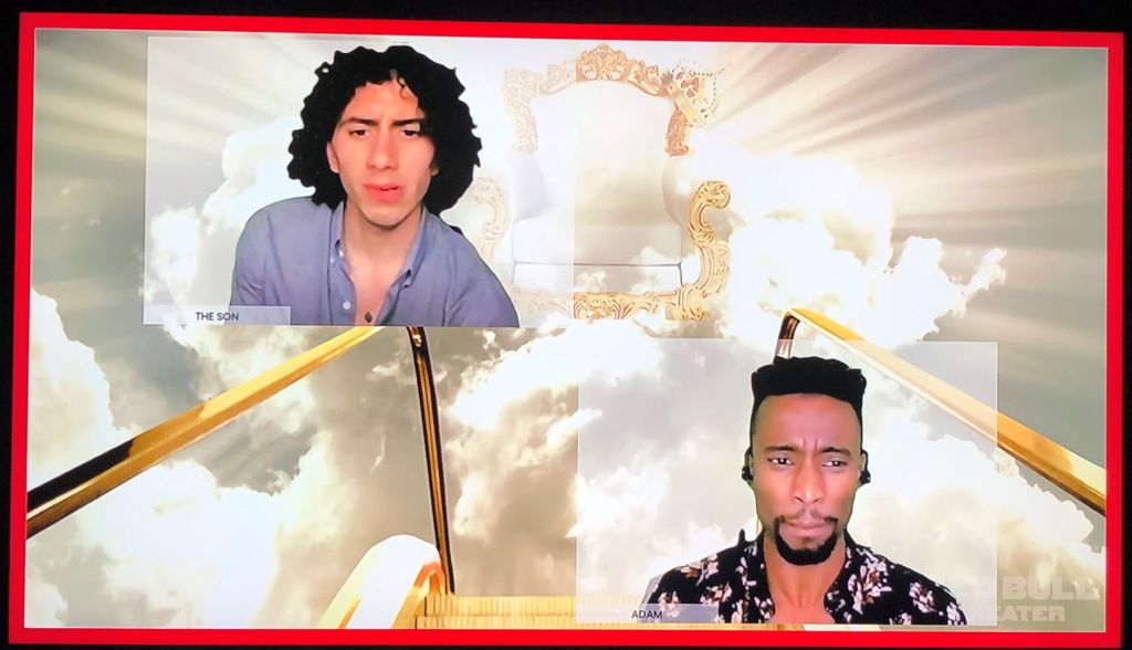 The actors introduced themselves in the beginning, and were Zooming in from all around the country, which was pretty cool. I soon discovered that the backgrounds were used to set the scene, just like background are used on stage. With greenery you see above to represent the Garden of Eden, a black and red jagged background to show Hell, and my favourite of all was the top of a gold escalator surrounded by clouds that represented Heaven.