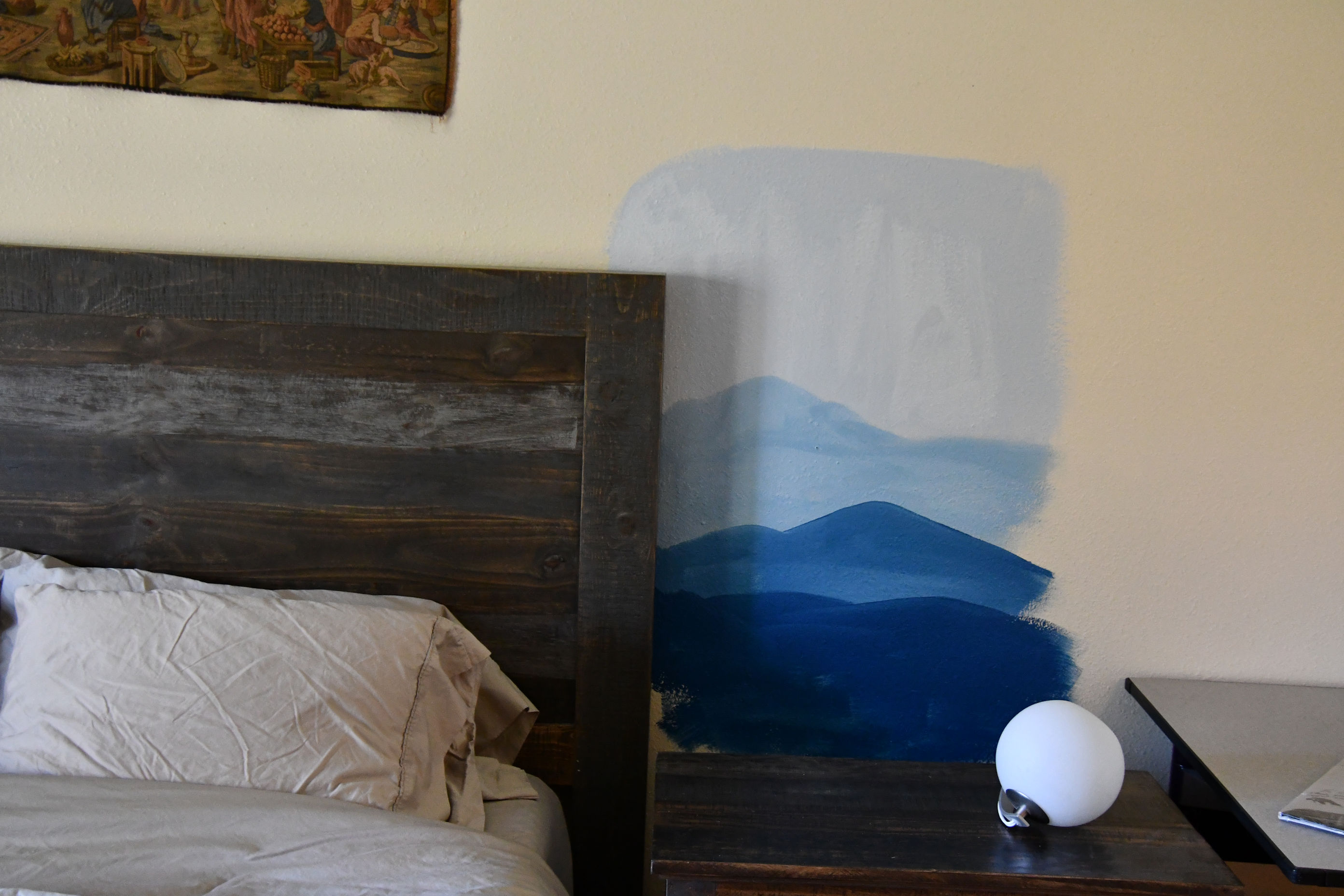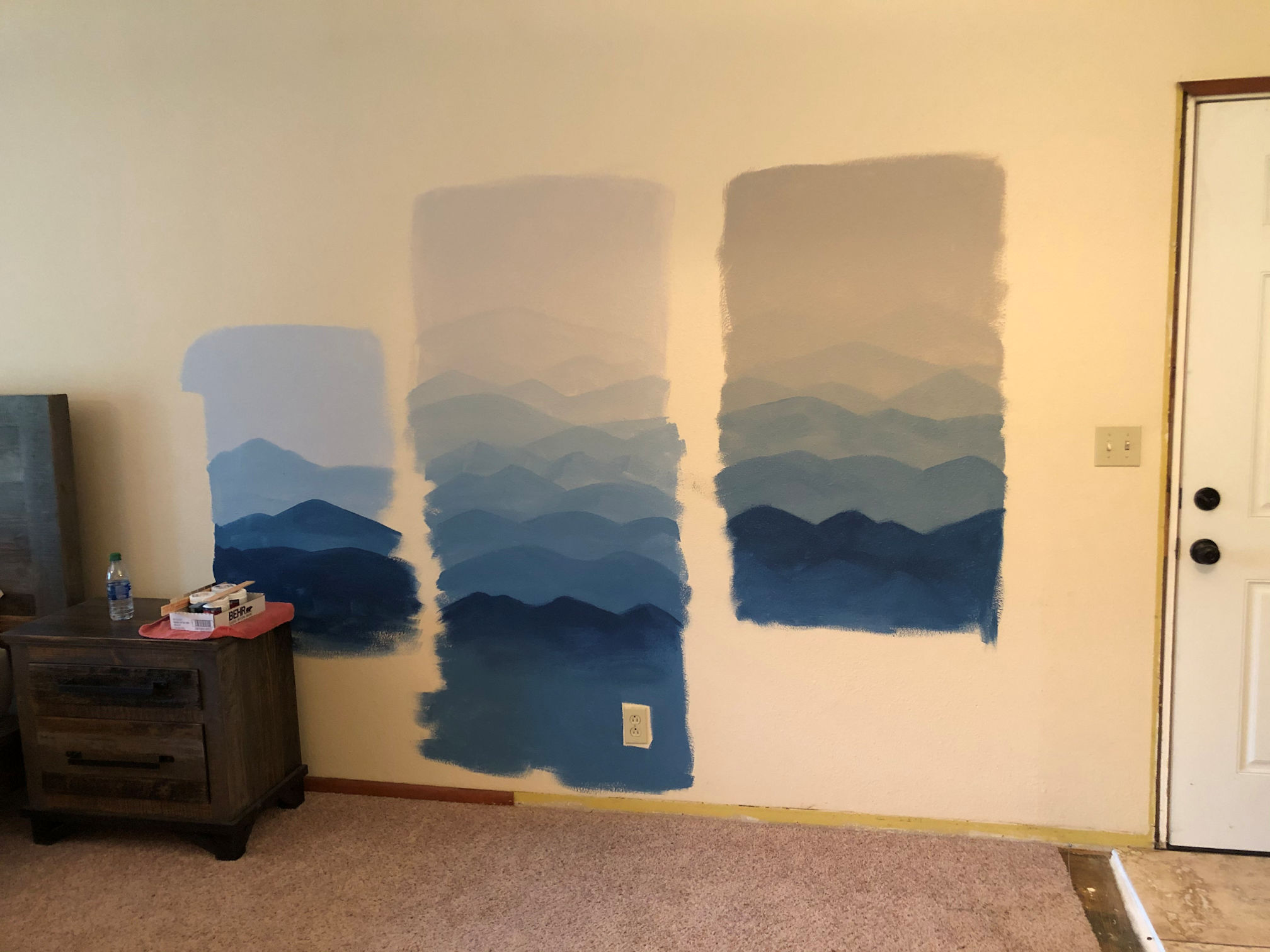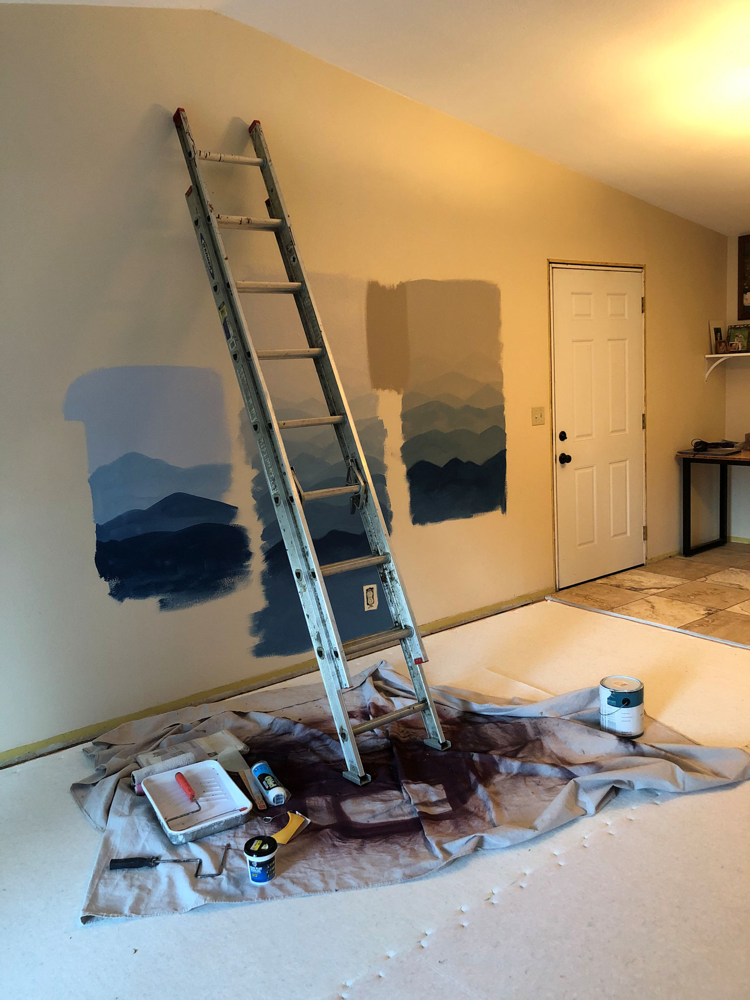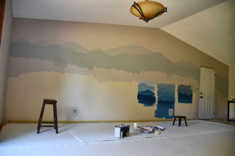 I wanted a blue room, so I chose a light blue for the sky and a dark blue for the hills. I painted a sample patch on the wall to see if it matched the furniture. When I’m getting ready to paint a wall inside my house, I do this. If I paint a big patch on the wall, then walk past it ten times a day for a few days, I get a sense of whether I like it or not.