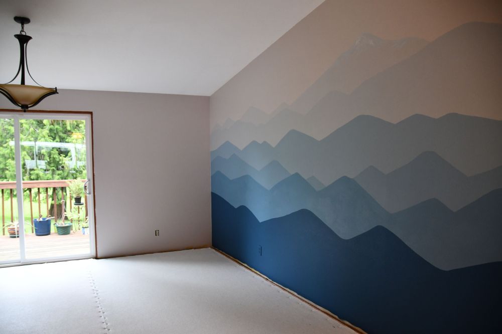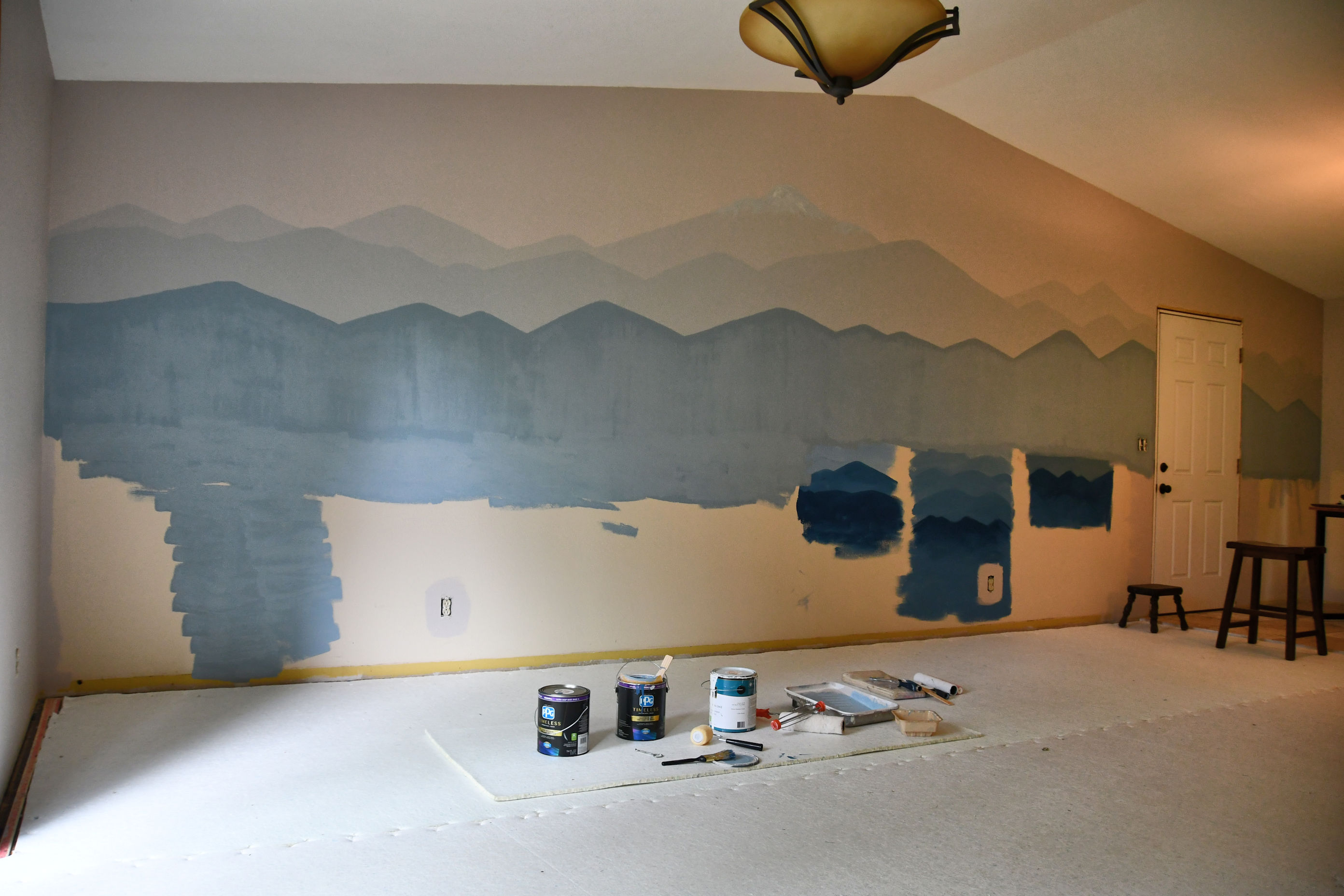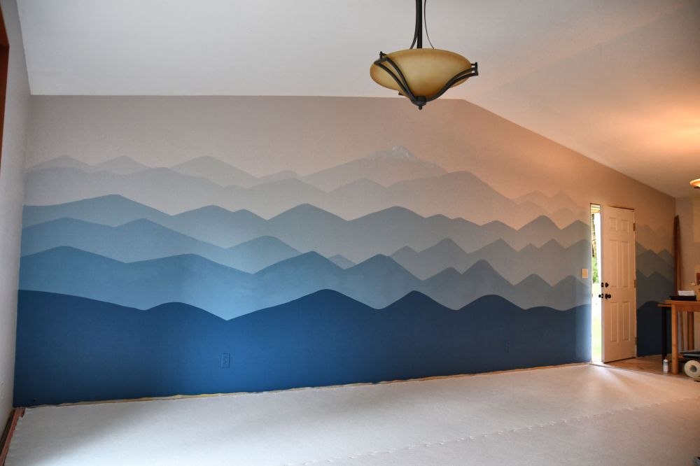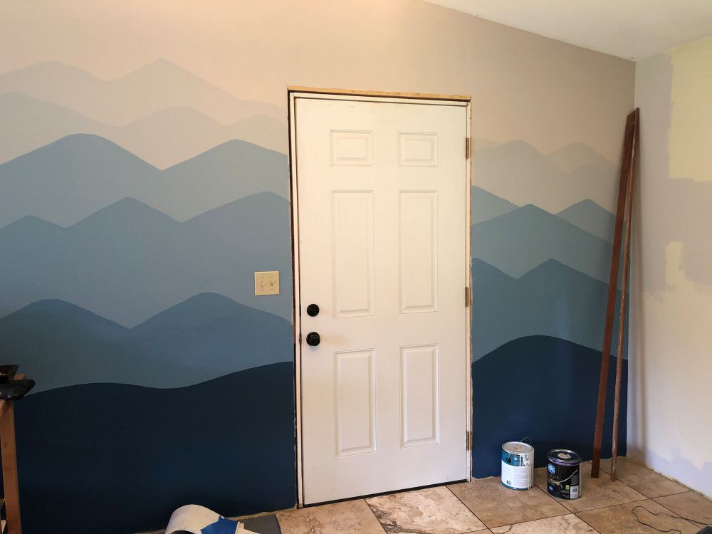 I wanted a blue room, so I chose a light blue for the sky and a dark blue for the hills. I painted a sample patch on the wall to see if it matched the furniture. When I’m getting ready to paint a wall inside my house, I do this. If I paint a big patch on the wall, then walk past it ten times a day for a few days, I get a sense of whether I like it or not.