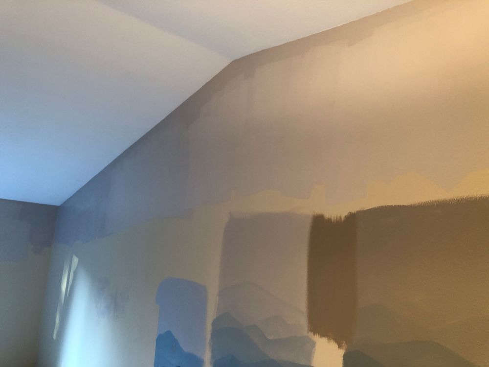 To avoid gaudiness, my idea was to do mountains on only the largest wall, but do all the other walls in the light colour, whatever that colour ended up being. So I had to really like the colour. I kept staring at the light blue on the wall and each day liked it a little less. Pedro had long ago suggested a light greyish-brown, but originally I didn’t think it was a good idea. After staring at the baby blue for two weeks, I changed my mind and bought two more sample paints.