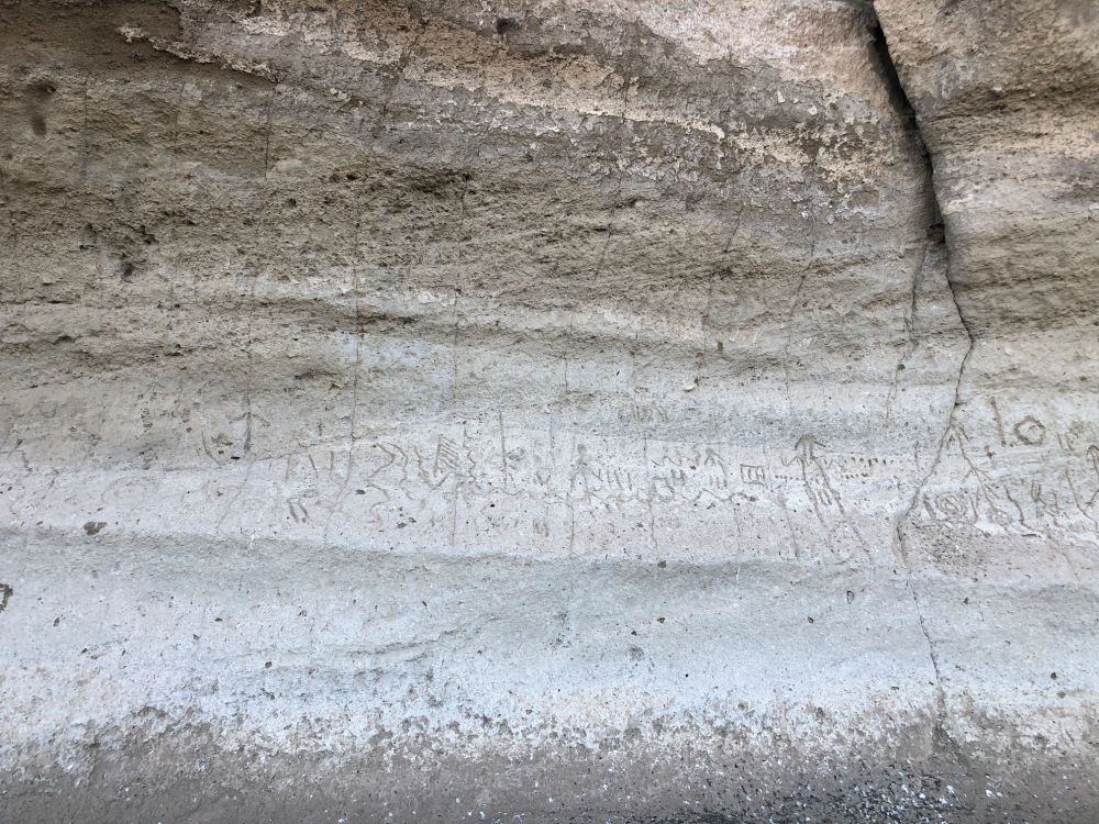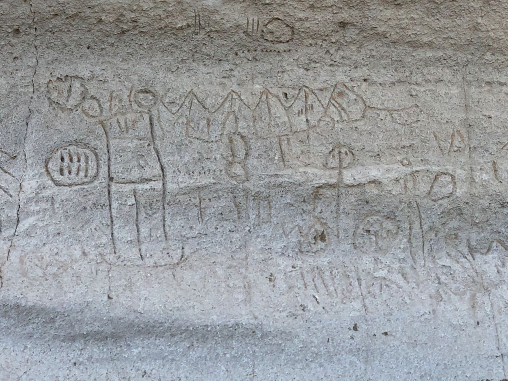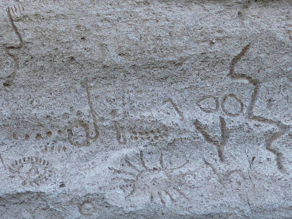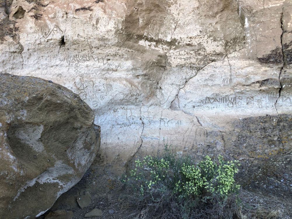 Over 5,000 individual carvings have been counted on this rock face alone, and there are many more in the area. There is a short trail leading to more art at the back side of this rock, and we talked to other visitors there with us that day, who had visited Castle Rock and found more art up there.