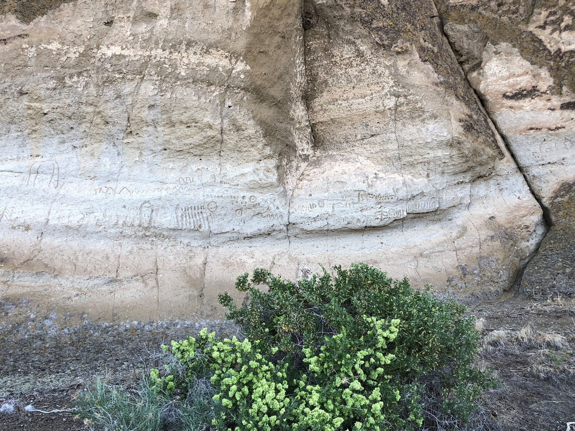 While planning the trip, Pedro (who knows the area) mentioned a wall of petroglyphs nearby. He used to ride his bike over there. I had never heard of this site, and eagerly agreed to add it to our itinerary. Imagine my pleasure when we arrived and discovered that these are Modoc petroglyphs. Well, of course they are because this is Modoc Land. I don’t know why I didn’t think of it earlier.