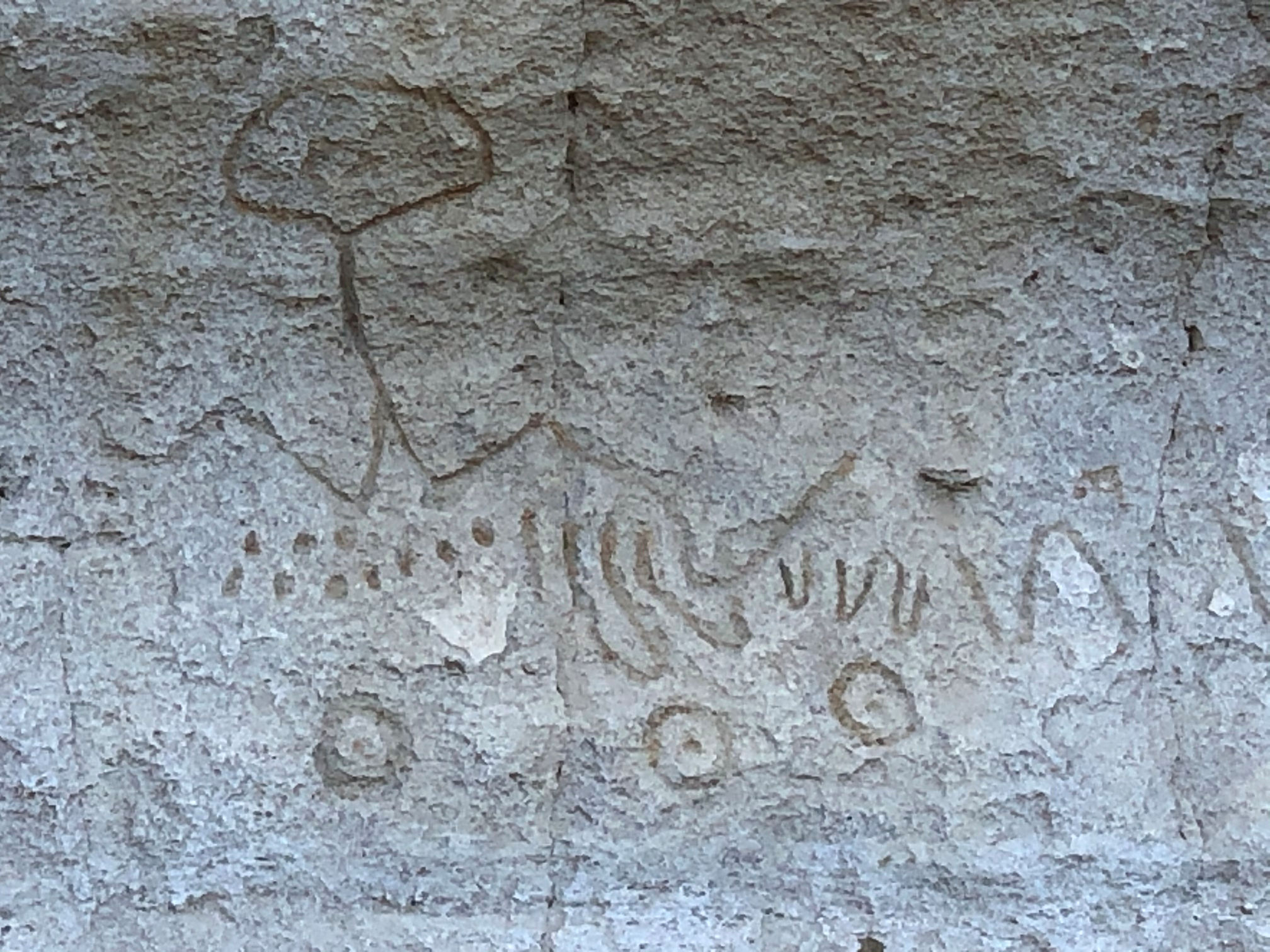 A couple of websites note that this spot is remarkable because there are less people depicted than usual for petroglyphs and it consists almost entirely of geometric shapes. I’m not sure what they mean because these, like all the sites I’ve seen, include a mix of figures and geometric shapes. You take a look and see what you think. They include: figures that I don’t recognize (but they remind me of spiders and worms and aliens and people), shapes, dots, chevrons, circles, etc. My Cherokee friend Joe encourages me not to try to translate Native wall art by guessing how the shapes resemble things I know, and to try to feel them and understand them that way. I don’t get it. But I try.