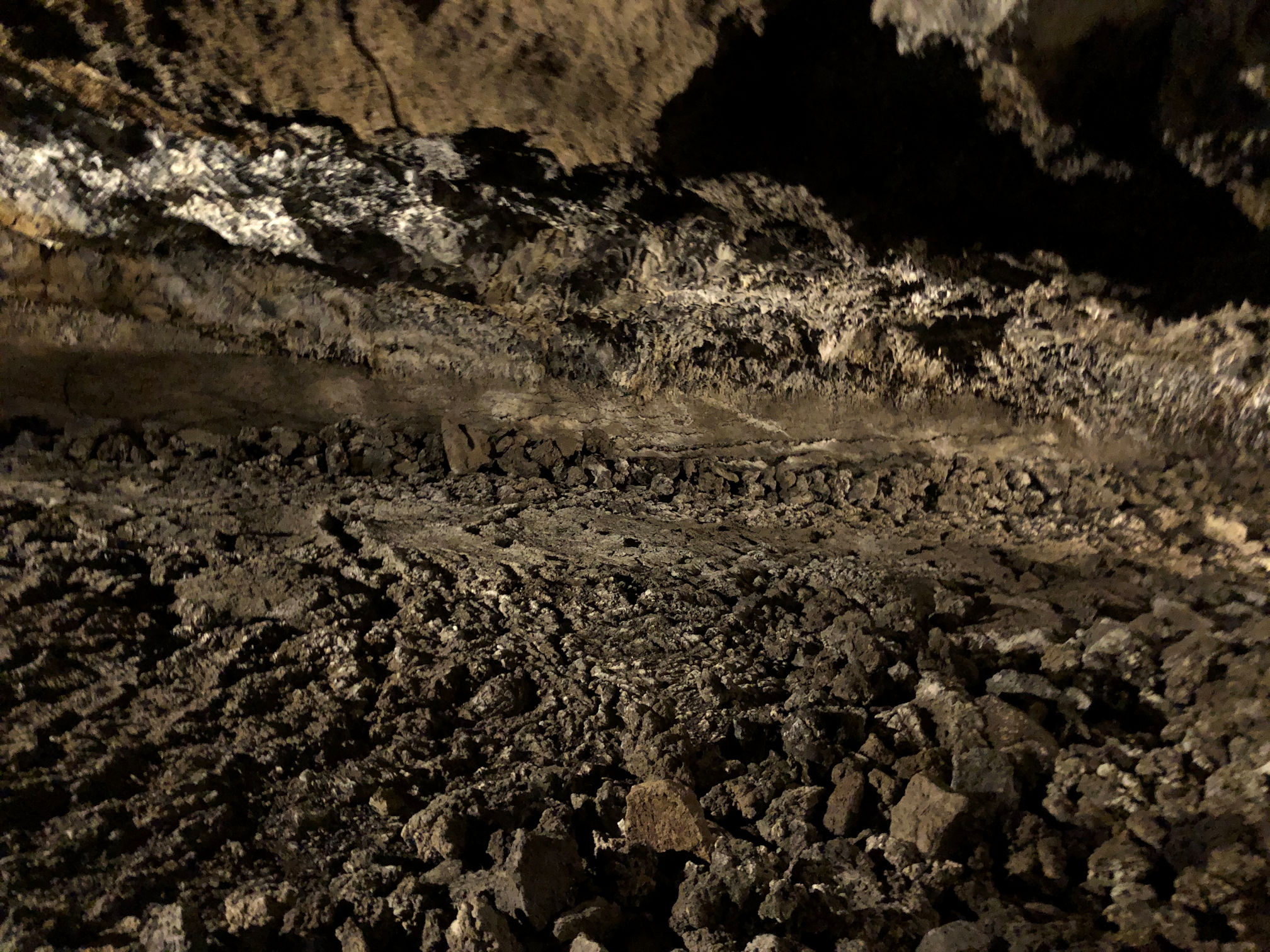Lava tubes, or lava caves, are formed when a river of lava flows over the ground. It’s thick, and flows in the shape of a flattened tube. The outside of the tube cools quickly when it is exposed to the air, while the inside of the tube stays hot and continues to flow. When the source of the lava flow stops, the hot stuff inside flows out the other end, leaving an empty lava shell. The lava tubes nearly always grow smaller and smaller, as the amount of lava is reduced, until there is no more tube formation. People explore these caves because they often have a floor smooth enough to walk on and a roof high enough to stand upright. At least at the beginning. Near the end of the tubes, people like to crouch, and then crawl, to see how far into the tube they can get.