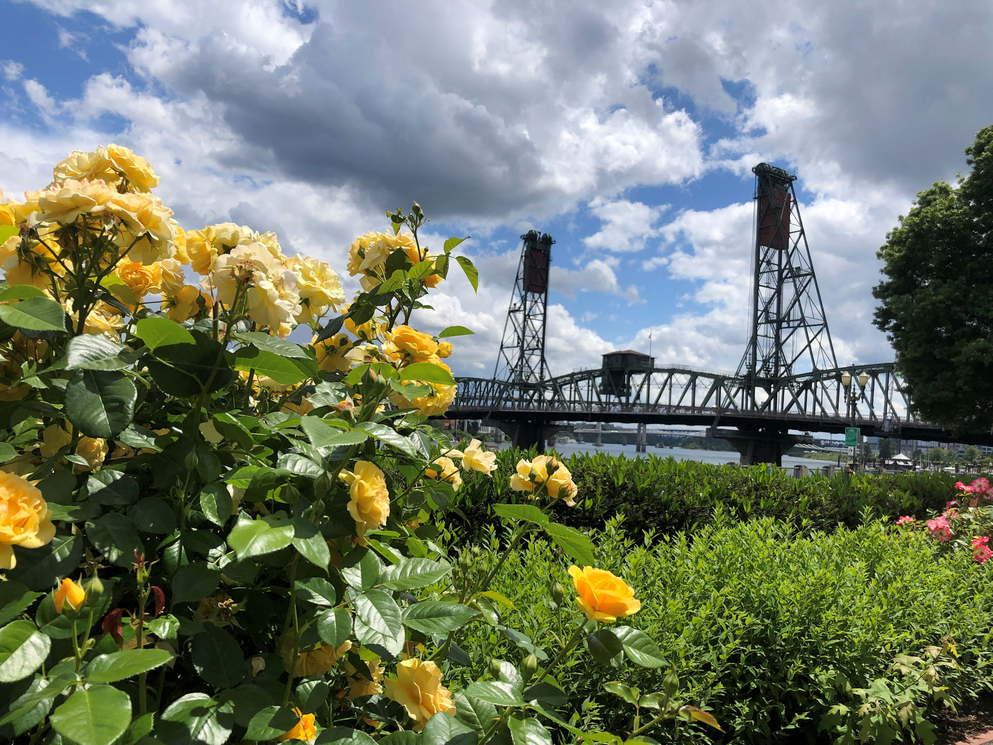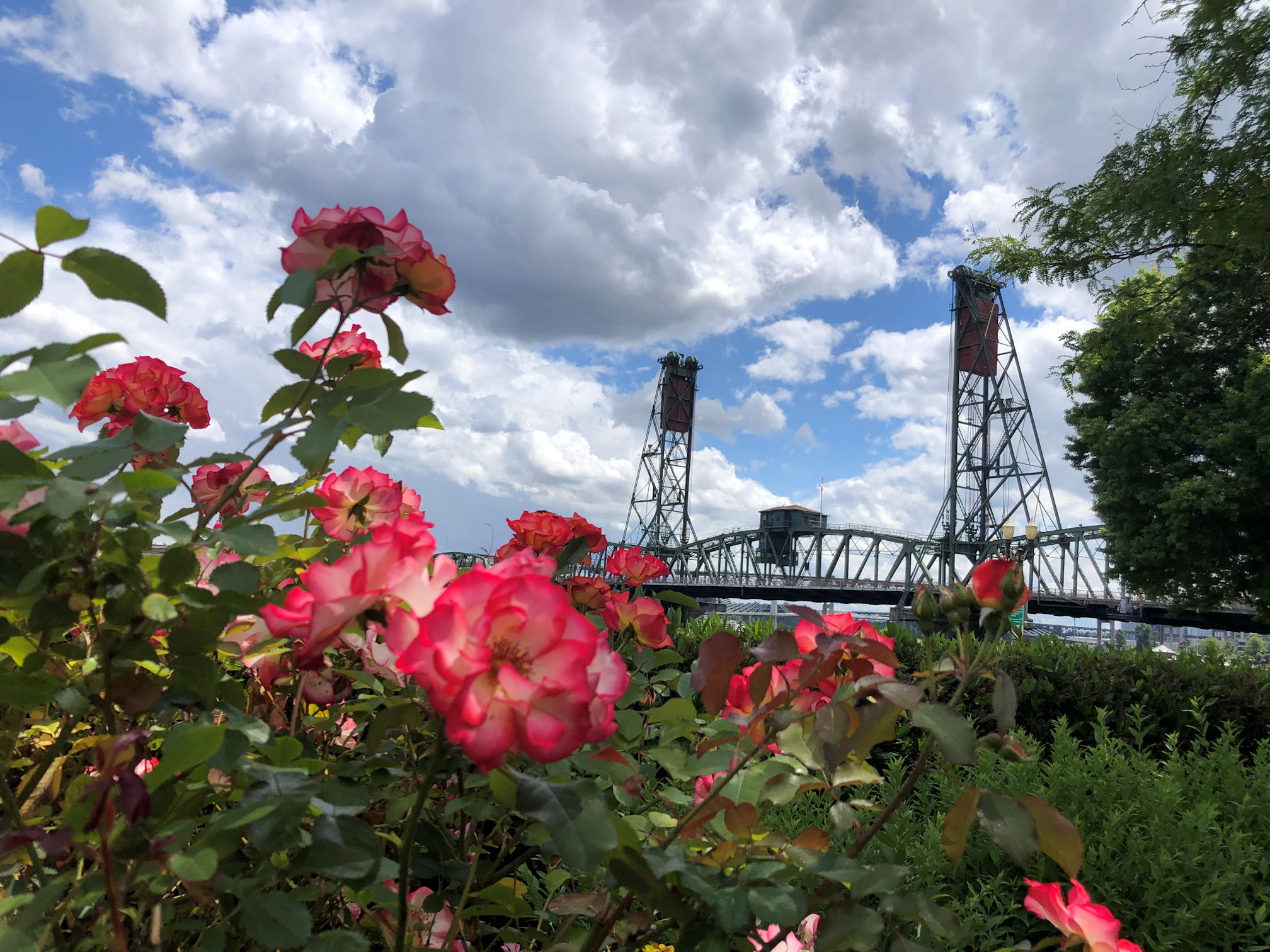 I came around the corner of a building and realized I could use the roses to frame a shot of my favourite Portland bridge: Hawthorne Bridge.