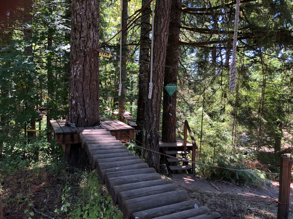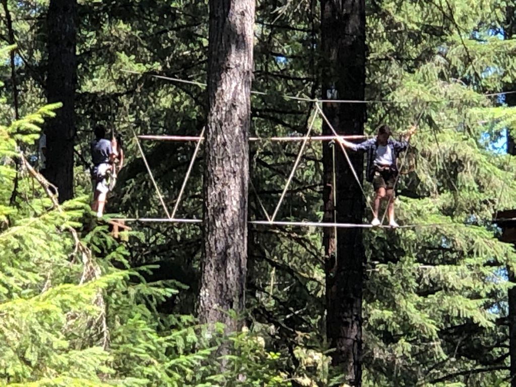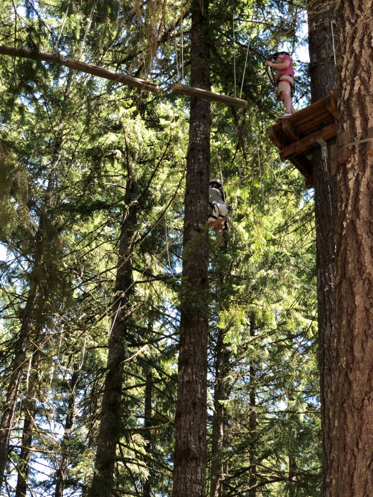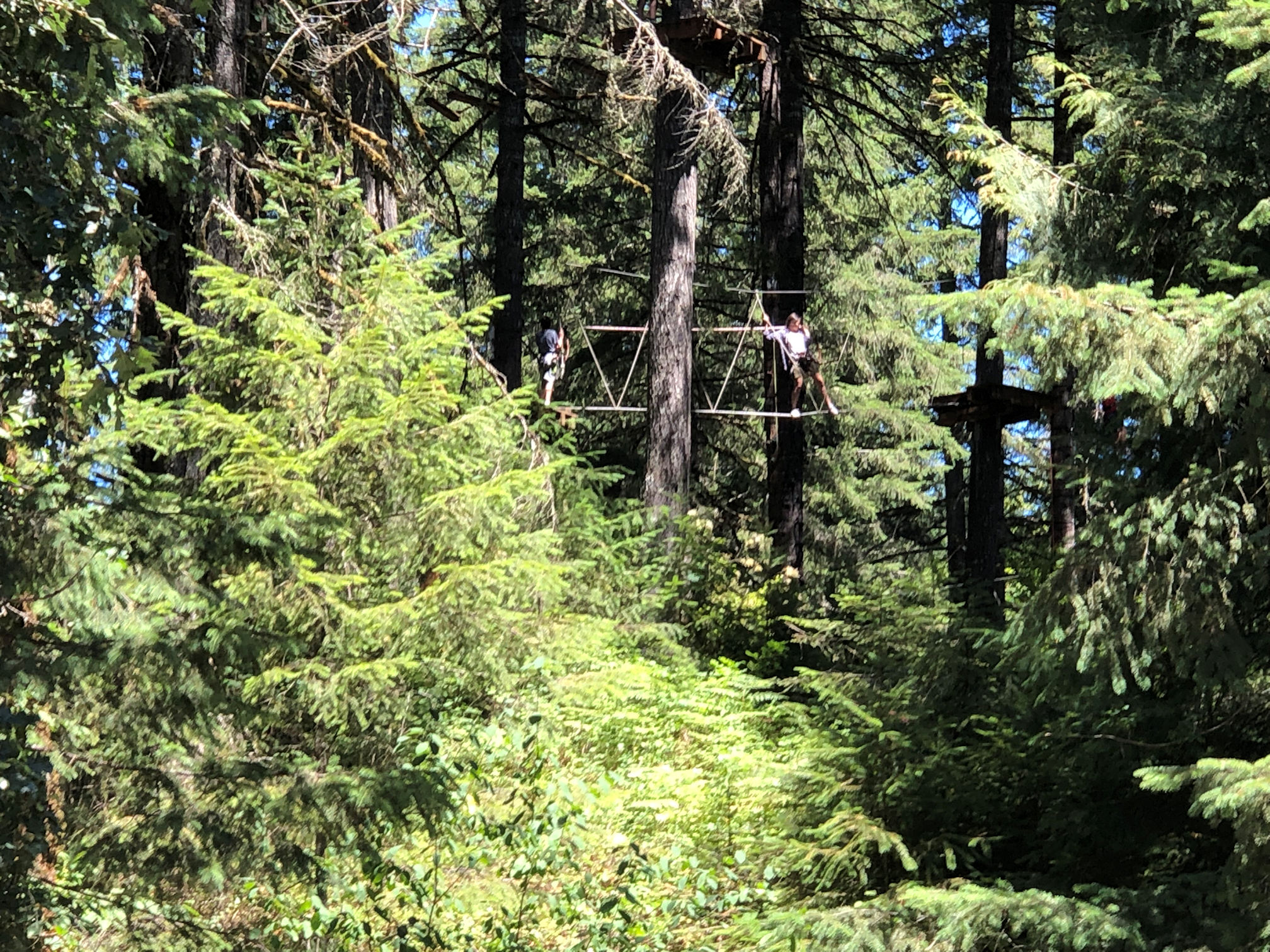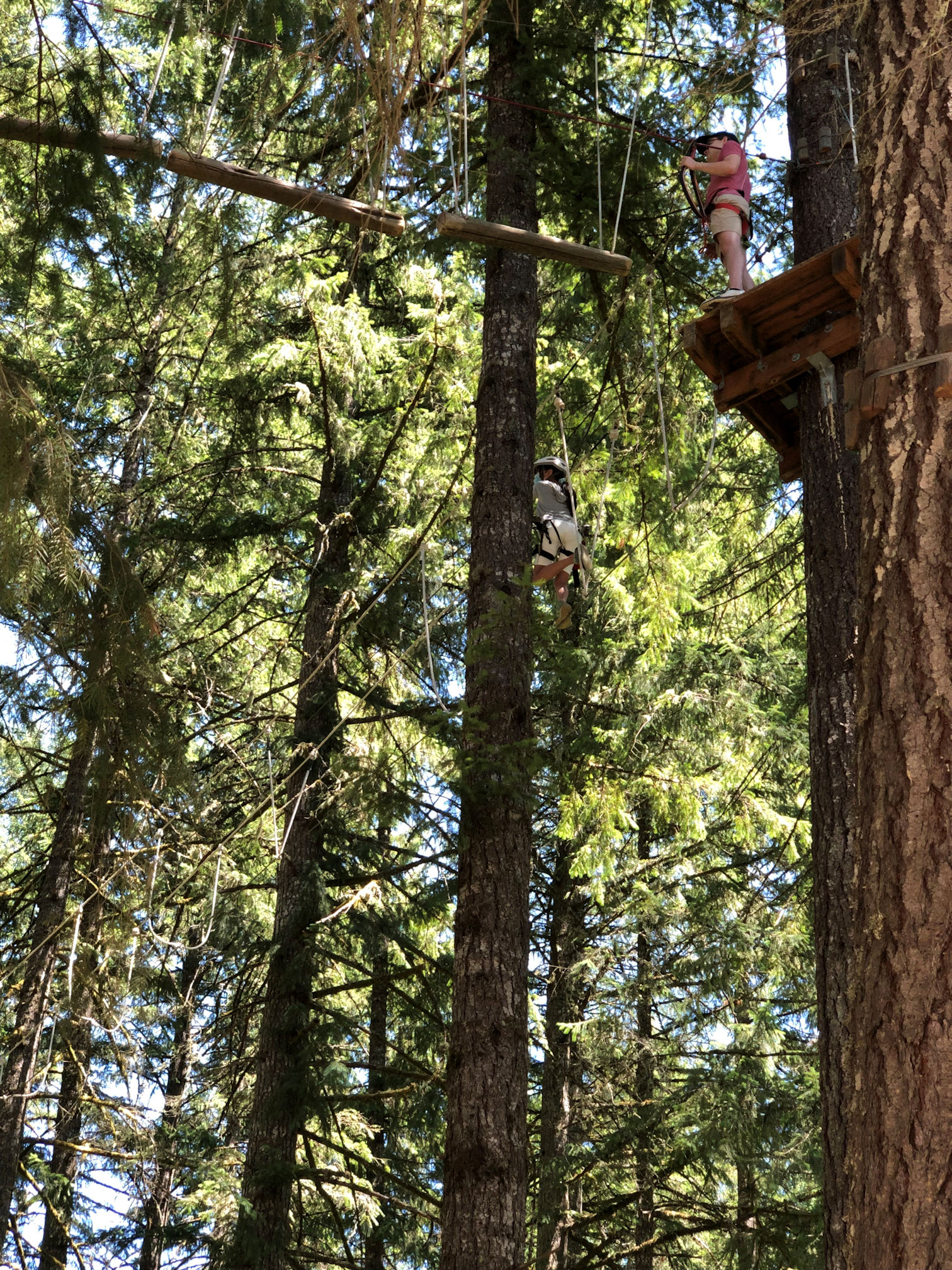 There were periods when I would be about to give up, and then some 8-year-old kid would come bounding up behind me, impatient for me to get going so she could take her turn. And I would clench my teeth and step off the platform, dangling in the air above the earth. I managed to control some mild hyperventilating and not look down but rather at the blessed platform ahead of me. I almost wanted to kiss each tree trunk when I arrived safely. I found myself becoming more and more excited each time I completed a course though. I was very proud of myself.