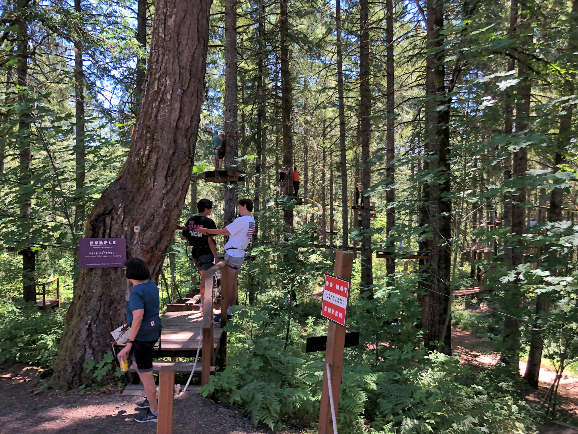 Each course was 5 or 6 segments between trees. In the photo above, you can see that the first segment is short and in no time you’re safely beside a tree trunk on a wooden platform. You then look to see if anyone is ahead of you. When the next segment has no one on it, you move your clips from the last segment to the next segment, and off you go to the next tree trunk. Very quickly, the segments get more challenging. The part you walk on becomes less and less stable. Sometimes you walk on ropes, and sometimes the wooden beams are on hinges, so when you step onto them they swing erratically horizontally above the earth. Sometimes there are gaps so wide you can’t step across and must jump, using dangling ropes above you to clutch at for dear life. The green level is about 15-20 feet above the ground, and each difficulty level gets not only harder to complete, but is higher. At the purple level, I was looking down below me onto people doing the green and blue level courses.