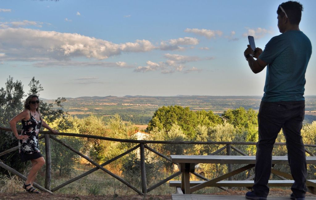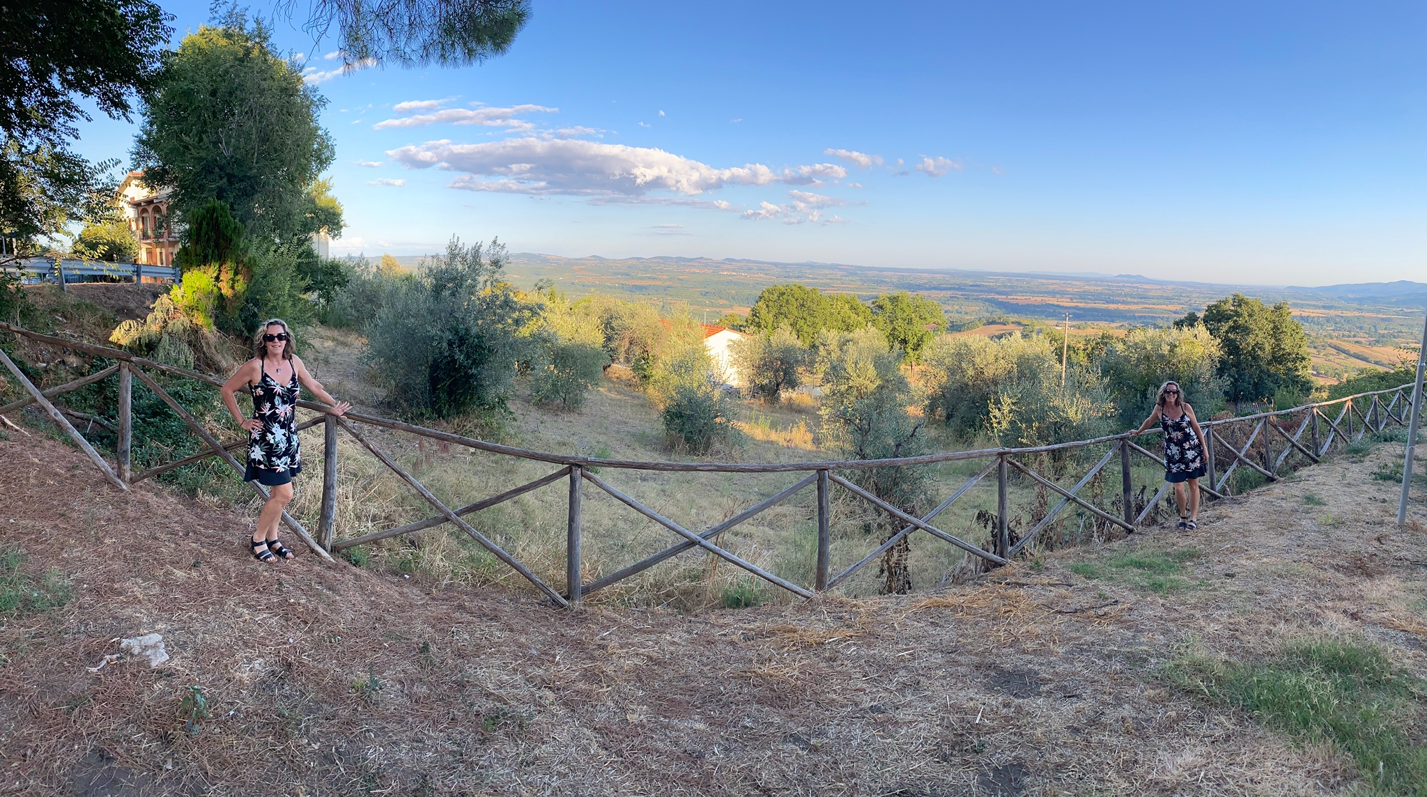 After all the walking around under the Etruscan sun, climbing many narrow passages in villages perched on mountain tops, we were ready to go home. We wound through the gorgeous Tuscan countryside once more, with a stop at San Martino sul Fiora where Manja knew there was an especially photogenic church. After admiring the church, we found our way to a vista point across from the church and goofed around with Pedro’s panoramic photo option on his phone. To make a panoramic shot, you aim your phone at one side of the view and slowly move it to the other side of the view. The camera makes it all into one long photo. I stood on the first side, and when I could see Pedro’s phone was no longer focused on me, I took off at a sprint! I ran behind Pedro and over to the other side of the view, and set myself up and waited for the phone to move to where I was. We had to do it about three times to get it right, and I was giggling and slipping on pine needles in my sandals while I ran. It must have been entertaining for Manja to watch.