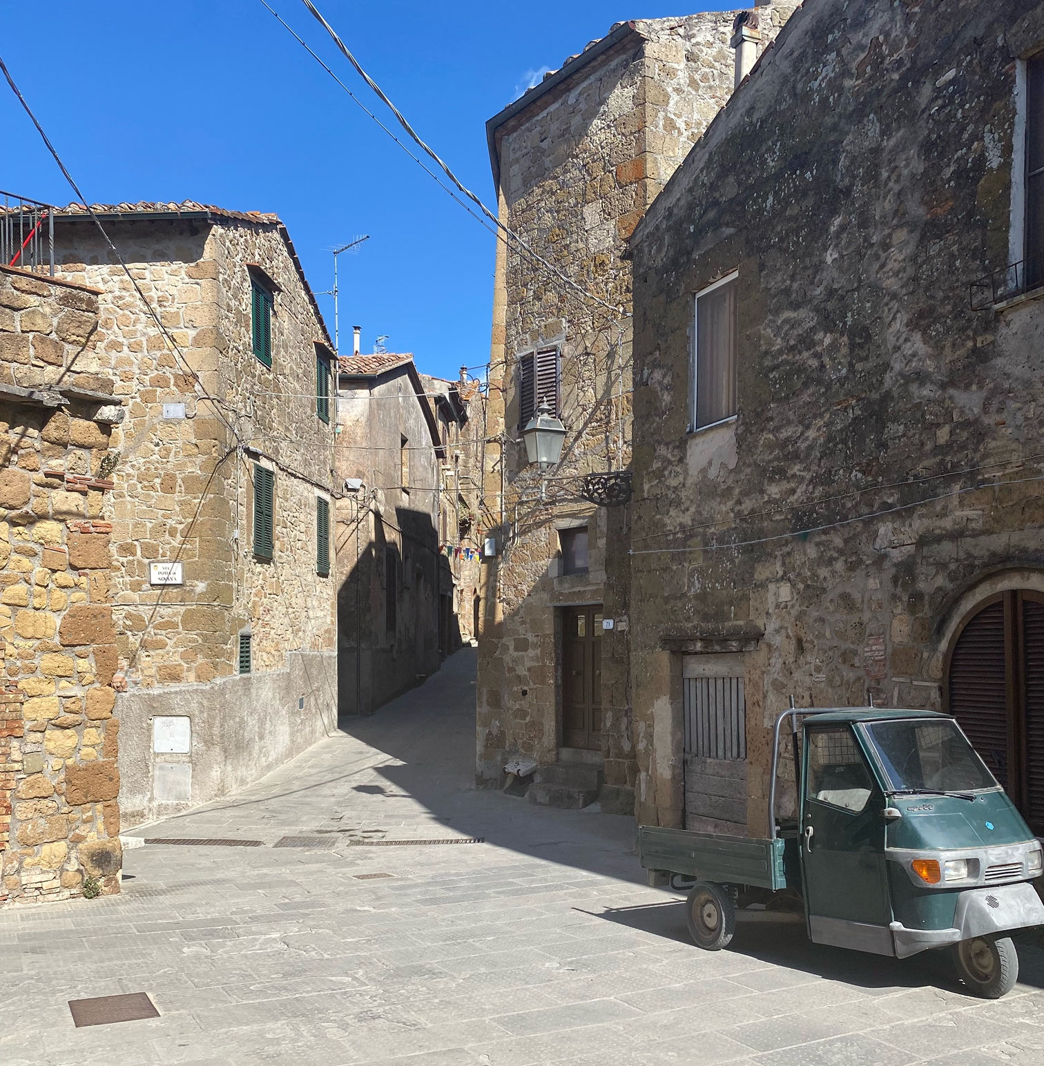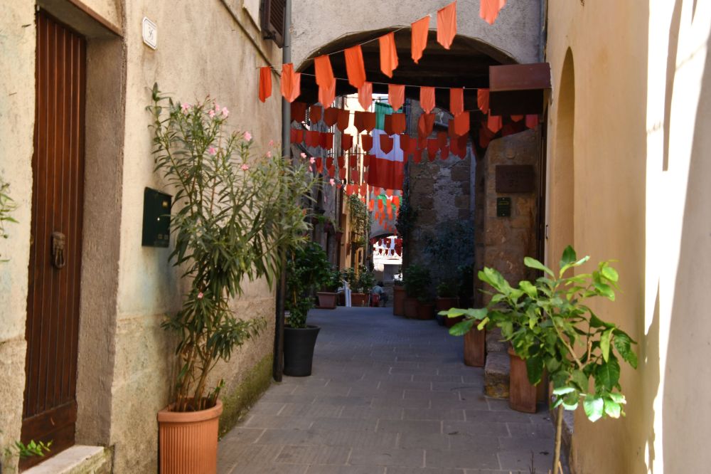 There are three tufa towns in the Maremma district. The other two are Sorano and Sovana. We made our way to Sovana next. We parked outside the village and walked in, passing a row of bins helpfully labeled so that it was easy for tourists to discover where to put which recycling materials or organic waste, etc. The final bin was labeled “?” We laughed all day as we imagined the things that could qualify for that bin, including things that are still alive, or radioactive waste.