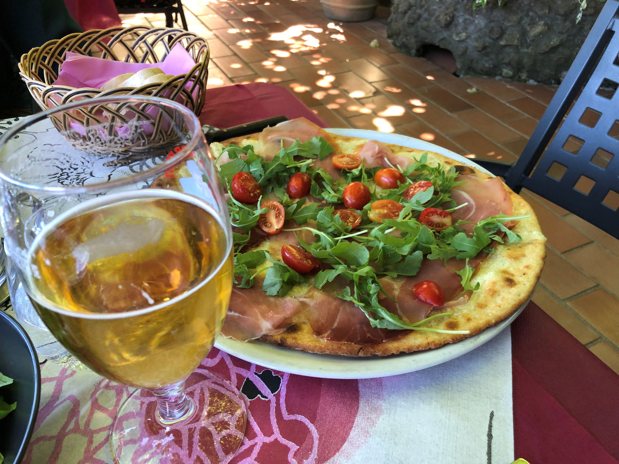The restaurant was exceptionally lovely and our food was outstanding. We were seated outdoors on a wide garden patio completely covered in grape vines and with a view of a neighboring mountain community. I have to include photos of the food too, because it was not only delicious but beautifully presented. Pedro had a pizza and I asked for mushroom pasta with truffles, because I had never tasted them.