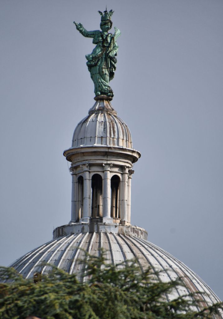 The church turned out to be an abbey, and it is on the edge of an enormous round square. (“round” square, haha). We had approached from the south, and not knowing anything about Padova, didn’t realize we were nowhere near the city center. What we did explore was the Abbey of Santa Giustina from all sides, and the enormous 90,000-square-meter ellipse called Prato della Valle. It is the largest city square in Italy and almost the largest in Europe. The square includes an inner and outer ring of 78 life-sized (and some greater than life-sized) statues and is surrounded by a moat, so that we had to cross bridges to get to the trees and the fountain in the center. Statues were on every side, even on the bridges we crossed. This made every photo impressive.