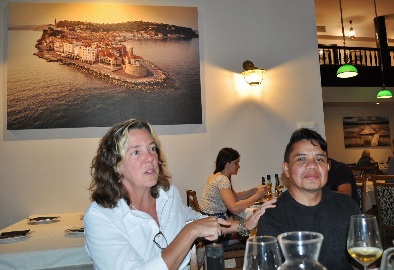 There is no visitor parking in the tiny town of Piran, so Marco dropped us and all our luggage near the center, and returned the car outside of town to a parking garage. Branko and Meta were standing there to greet us with smiles and hugs and hellos. Bestia jumped with happiness. We all grabbed as much as we could carry and they led us up the hill along narrow stone walks until we arrived at their home. As soon as we had unloaded, Marco returned, and Branko hurried us back down the hill because we had reservations at a local restaurant.
