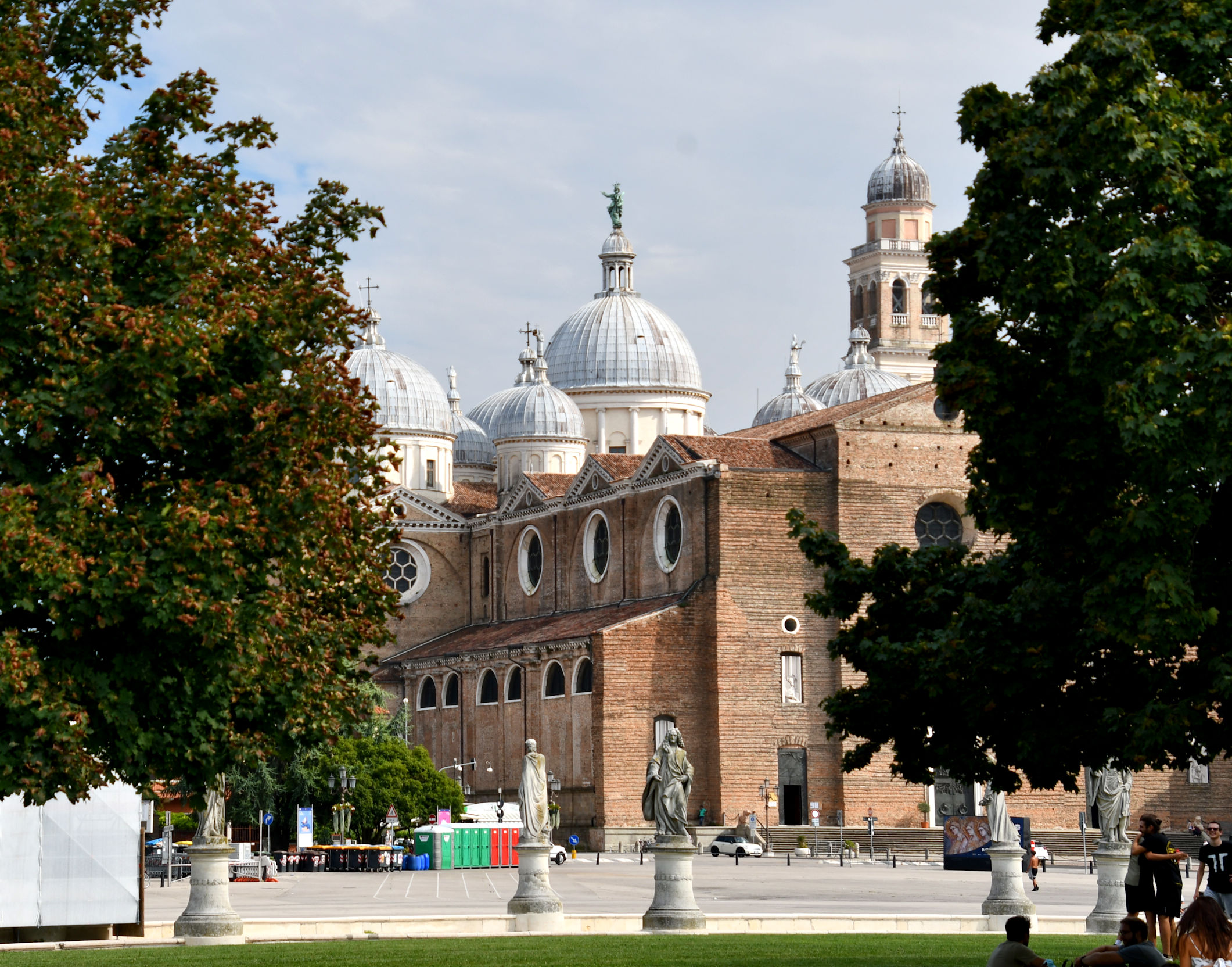 The church turned out to be an abbey, and it is on the edge of an enormous round square. (“round” square, haha). We had approached from the south, and not knowing anything about Padova, didn’t realize we were nowhere near the city center. What we did explore was the Abbey of Santa Giustina from all sides, and the enormous 90,000-square-meter ellipse called Prato della Valle. It is the largest city square in Italy and almost the largest in Europe. The square includes an inner and outer ring of 78 life-sized (and some greater than life-sized) statues and is surrounded by a moat, so that we had to cross bridges to get to the trees and the fountain in the center. Statues were on every side, even on the bridges we crossed. This made every photo impressive.