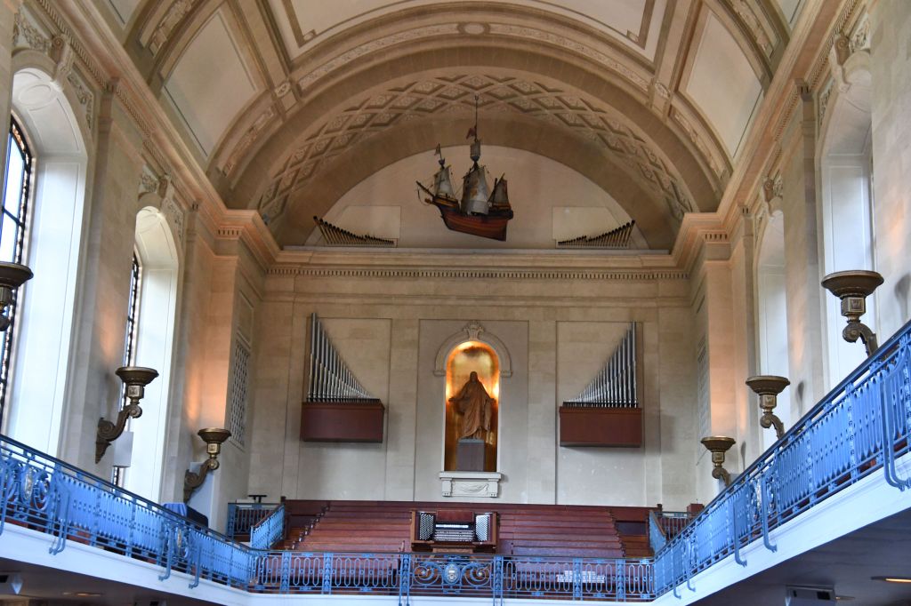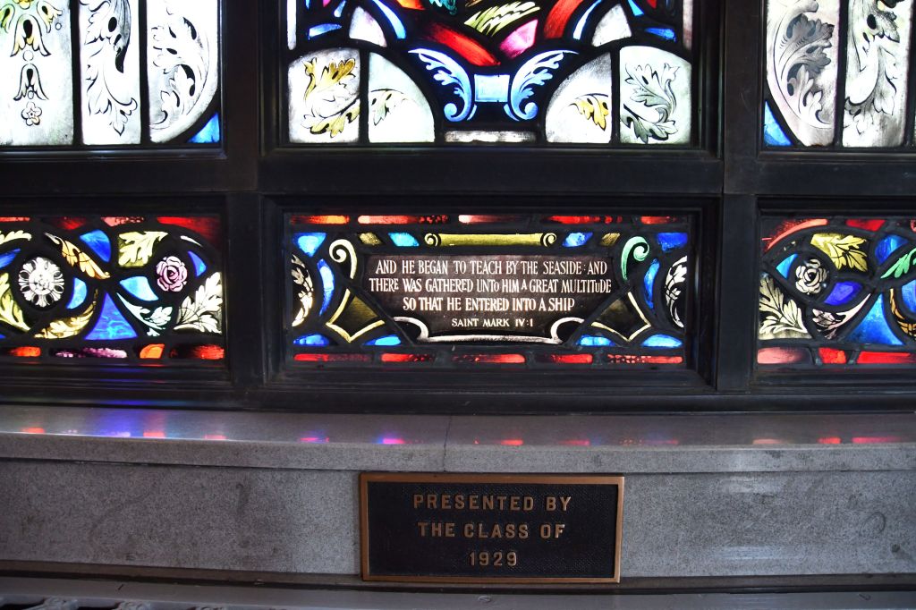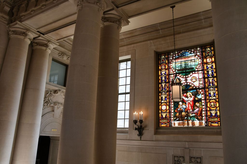 I learned from our guide that the stained glass lining the walls of the Naval Academy Chapel are all scenes from the Bible that mention ships, or the sea. There is even a model of a ship at the back of the church.