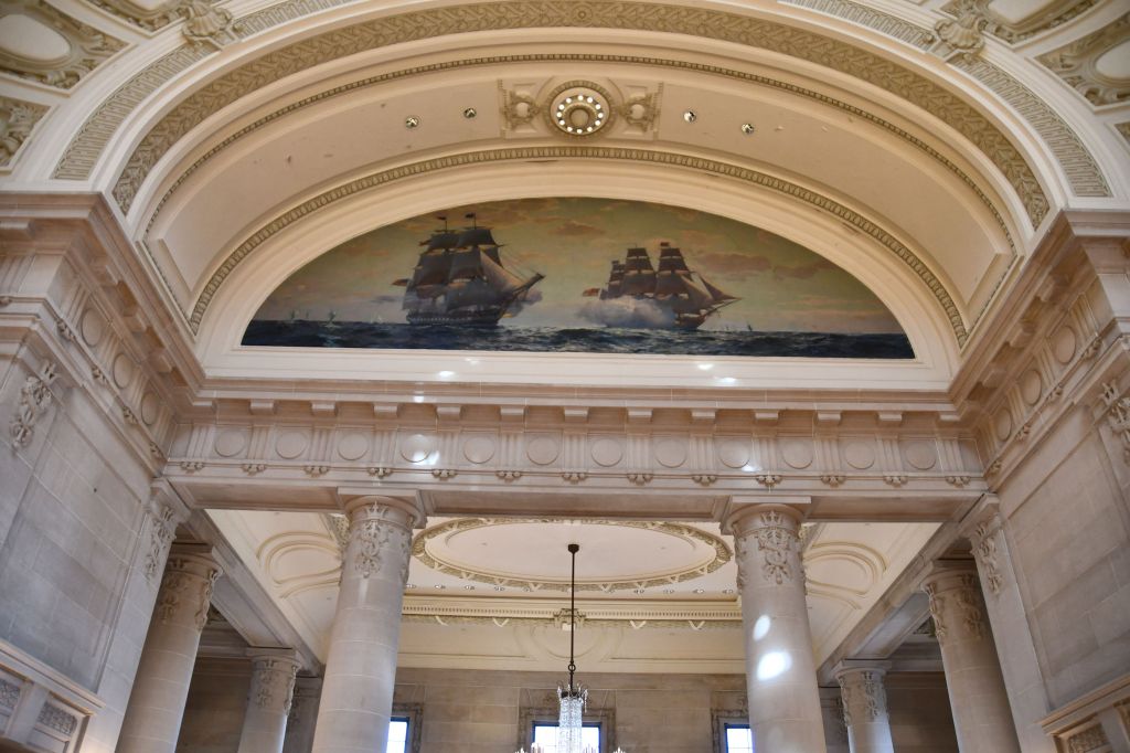 I learned that the students here, called midshipmen, are not allowed to enter the dormitories through the main entrance, but only through the side doors. They are told they must earn the right to enter through the front door, by graduating. As guests, we were allowed to walk right up the front steps and enter Bankcroft Hall, an enormous and stunning dormitory. You can see the front entrance behind our tour guide Jim, in the photo of him in a yellow shirt, above.
