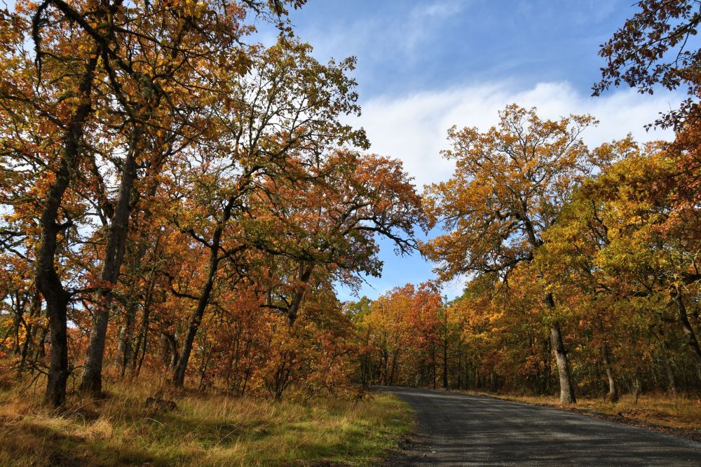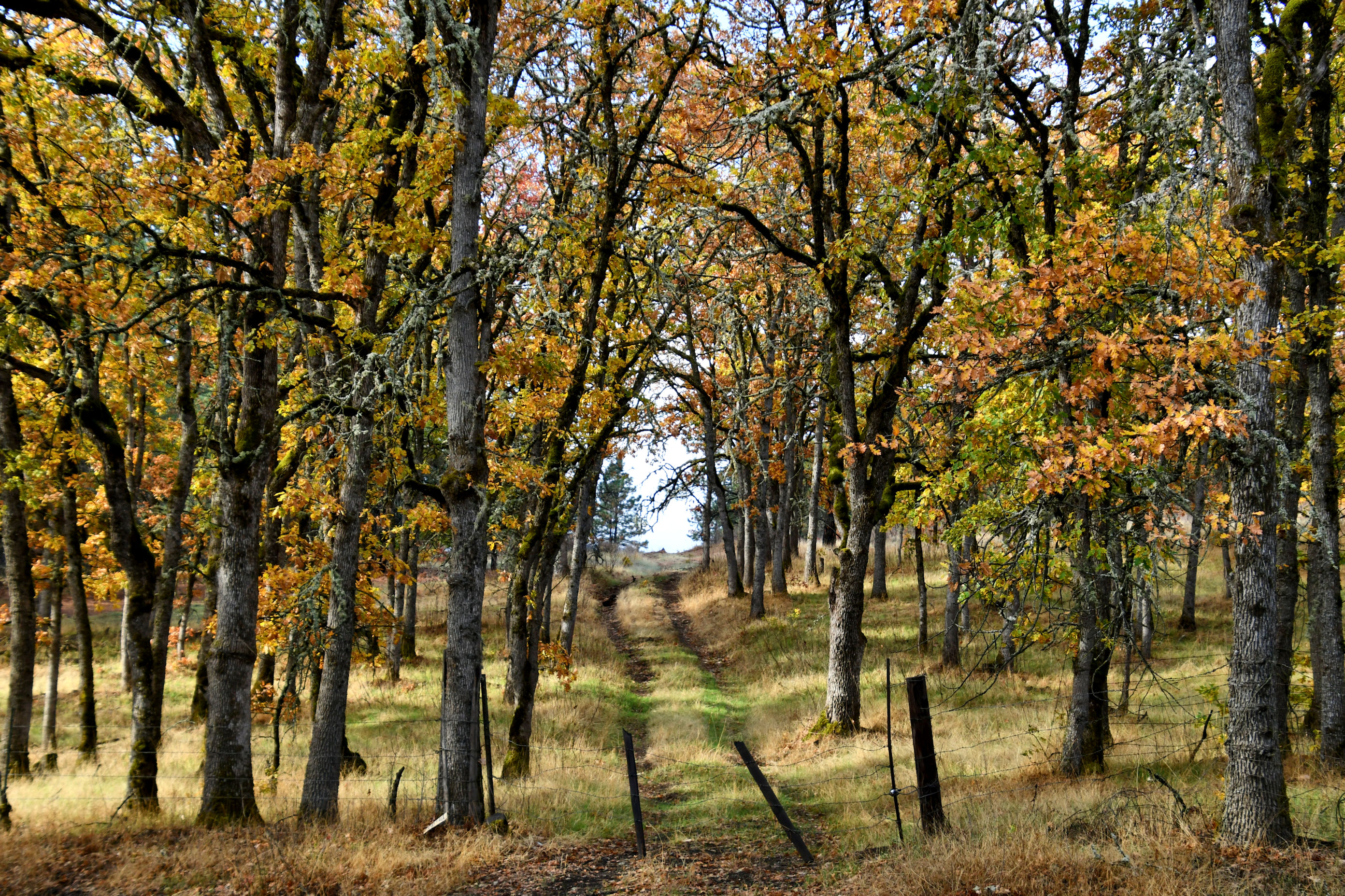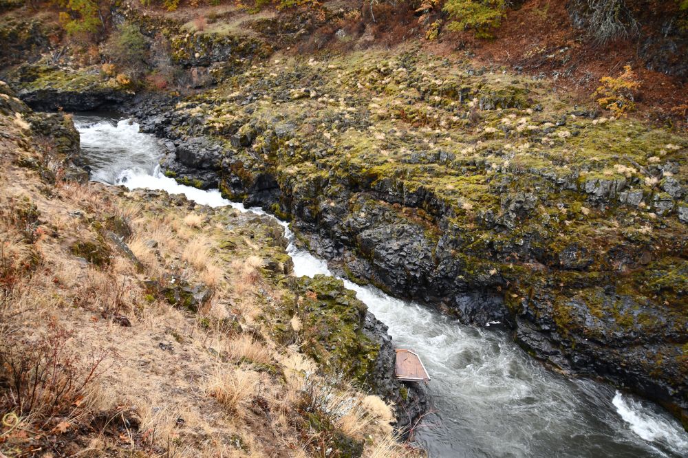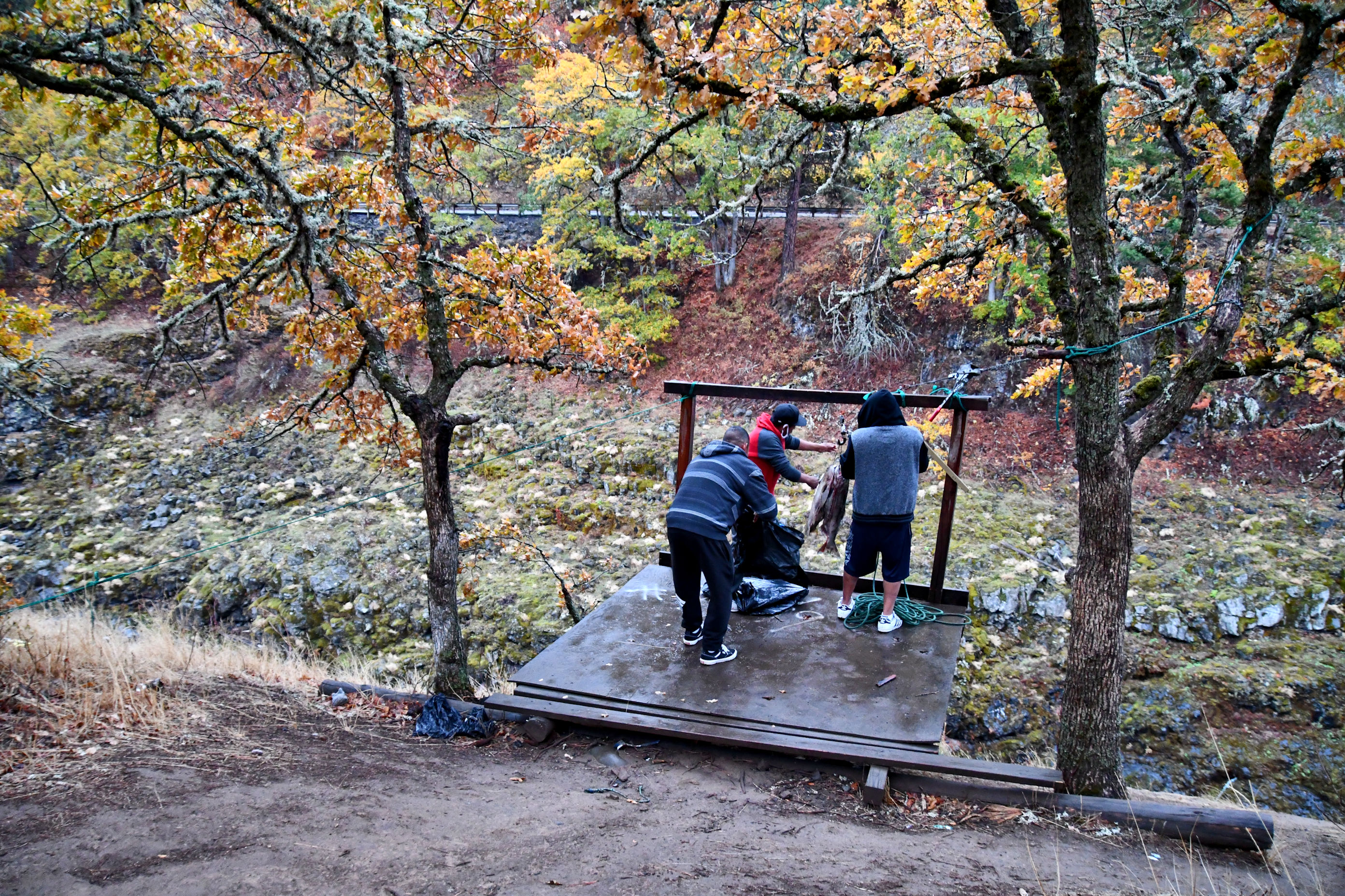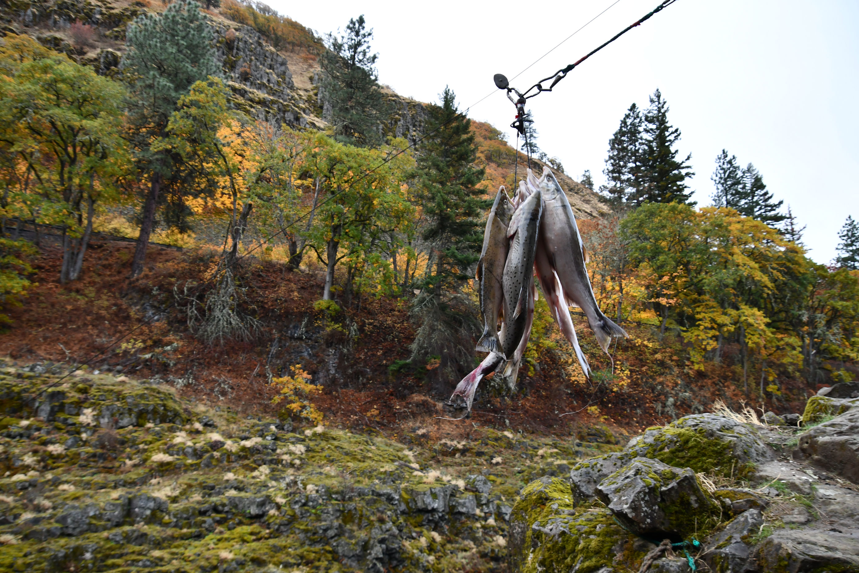 The narrow Klickitat River where salmon are jumping like crazy right now. You can see the trail on the right, that leads down the steep slope to the narrow river.One of the many platforms built along the river’s edge for fishermen and women to stand on while they are dip netting.The person fishing asked me not to use their photo, so I have obscured the person. This picture will help you see how the fishing is done. Note the very long pole, with a hoop and a net at one end. The fishermen will push the hoop out into the water, then pull it back to shore, hoping to net a fish. Look above the whitewater and you will see a salmon jumping.Fish buyers at the top of the hill have pulled up salmon along a line rigged from this platform down to the water.A new group of salmon being hauled to the top.Oaks above the Klickitat River dressed in copper and gold for the season.A lovely road through the trees.