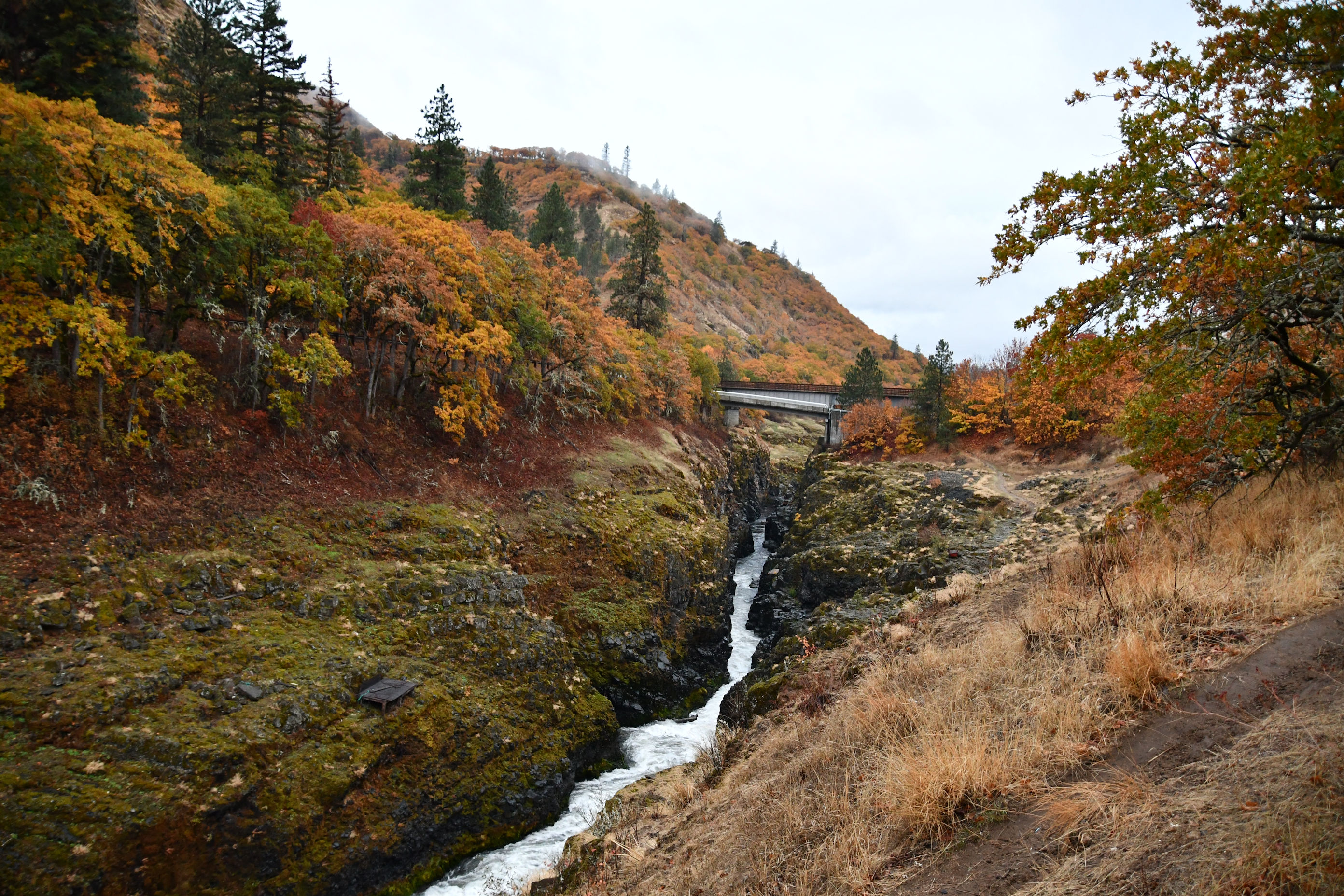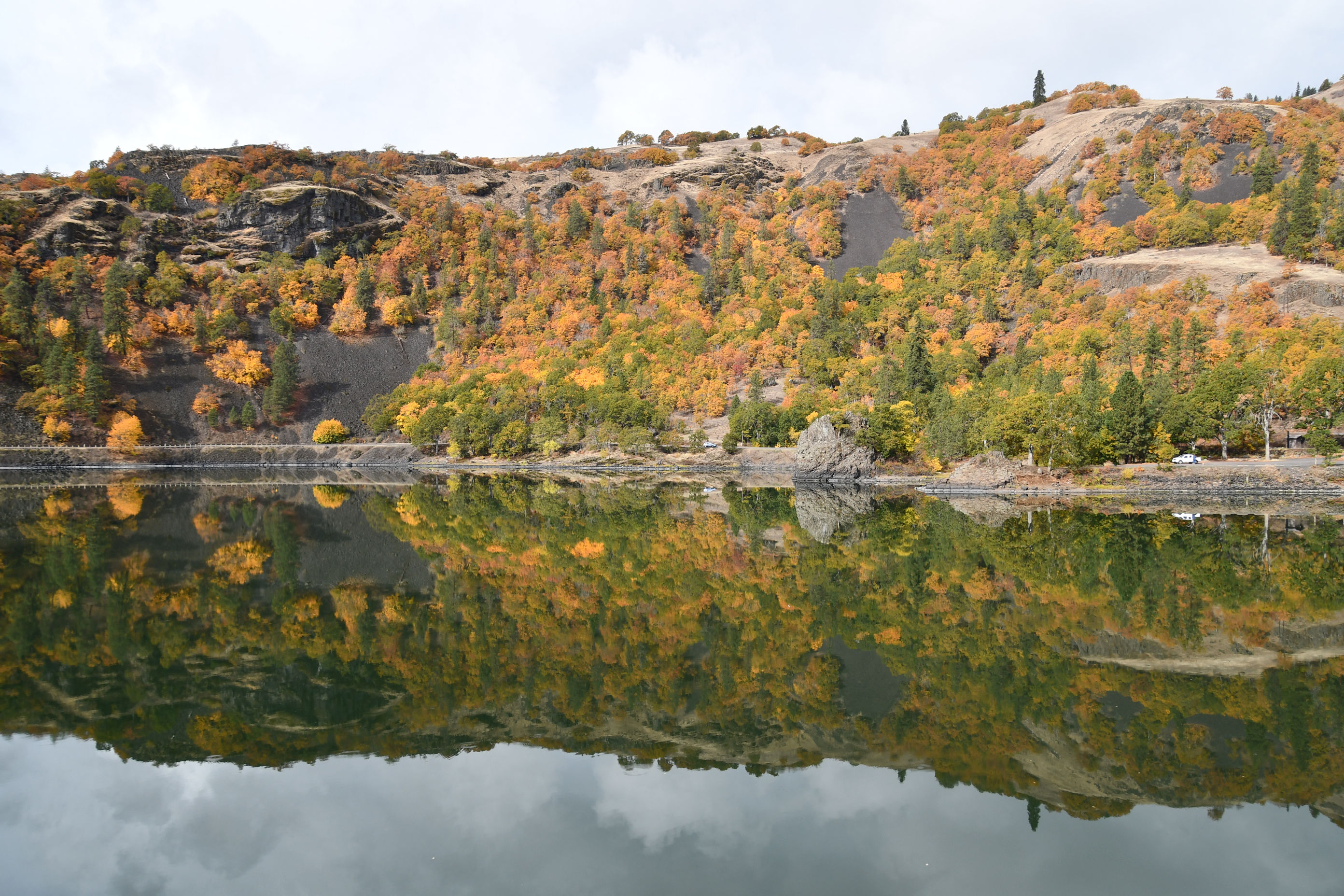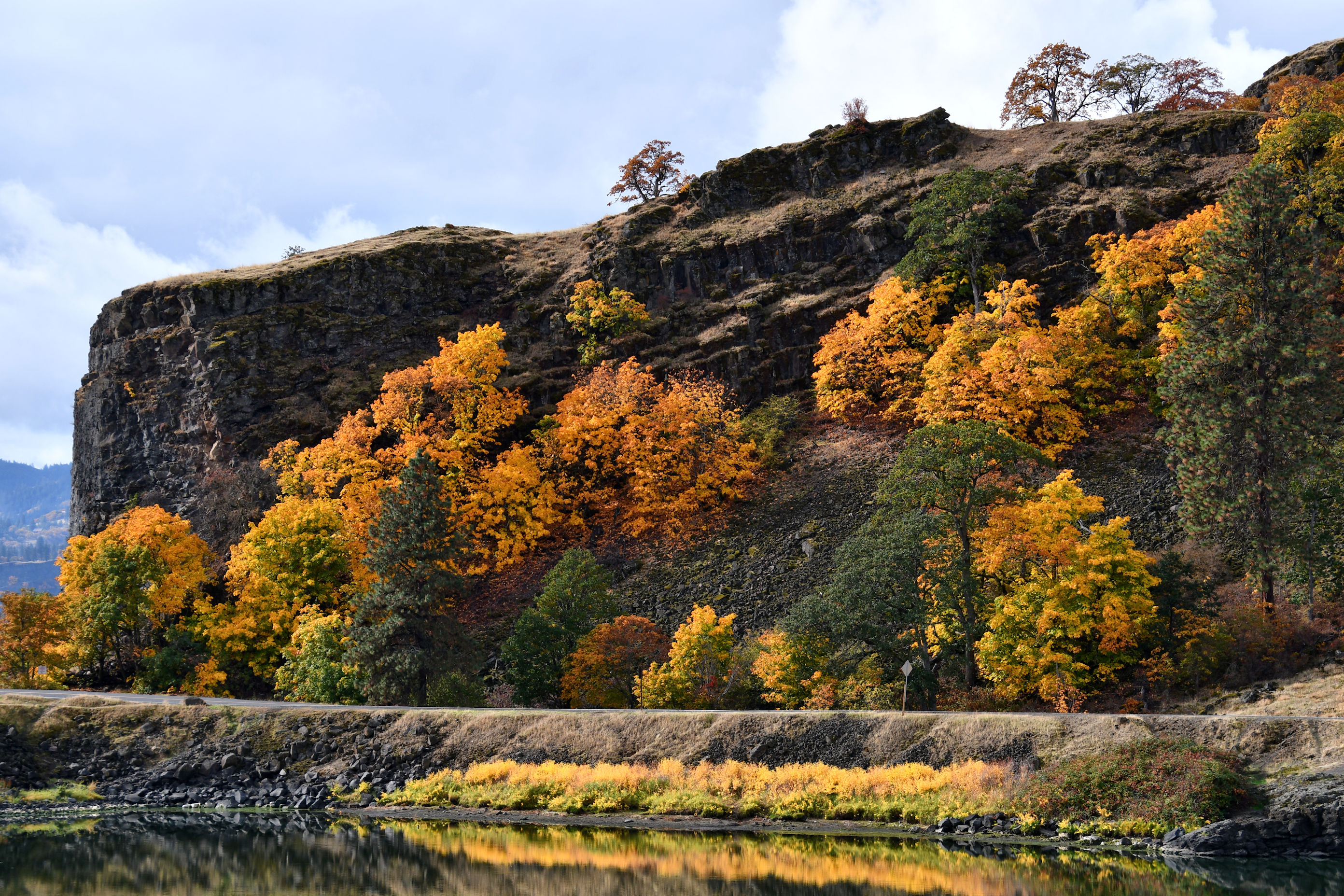 I met my friends at the Klickitat River at about 6:30am. It was dark and climbing down to the water’s edge was an adrenalin rush! I could hear the water roaring, and I could see a lighter grey streak where the water was, but we relied on headlamps to see the trail. As the sun came up, buyers showed up at the top of the hill and I climbed up there to help them with their purchase. Since I am not Yakama tribe, I am not allowed to fish, and I can only be on the rocky shore by invitation. When I got up to the top, I noticed the magnificent Fall colours, and grabbed my camera from my Jeep that was parked up there.