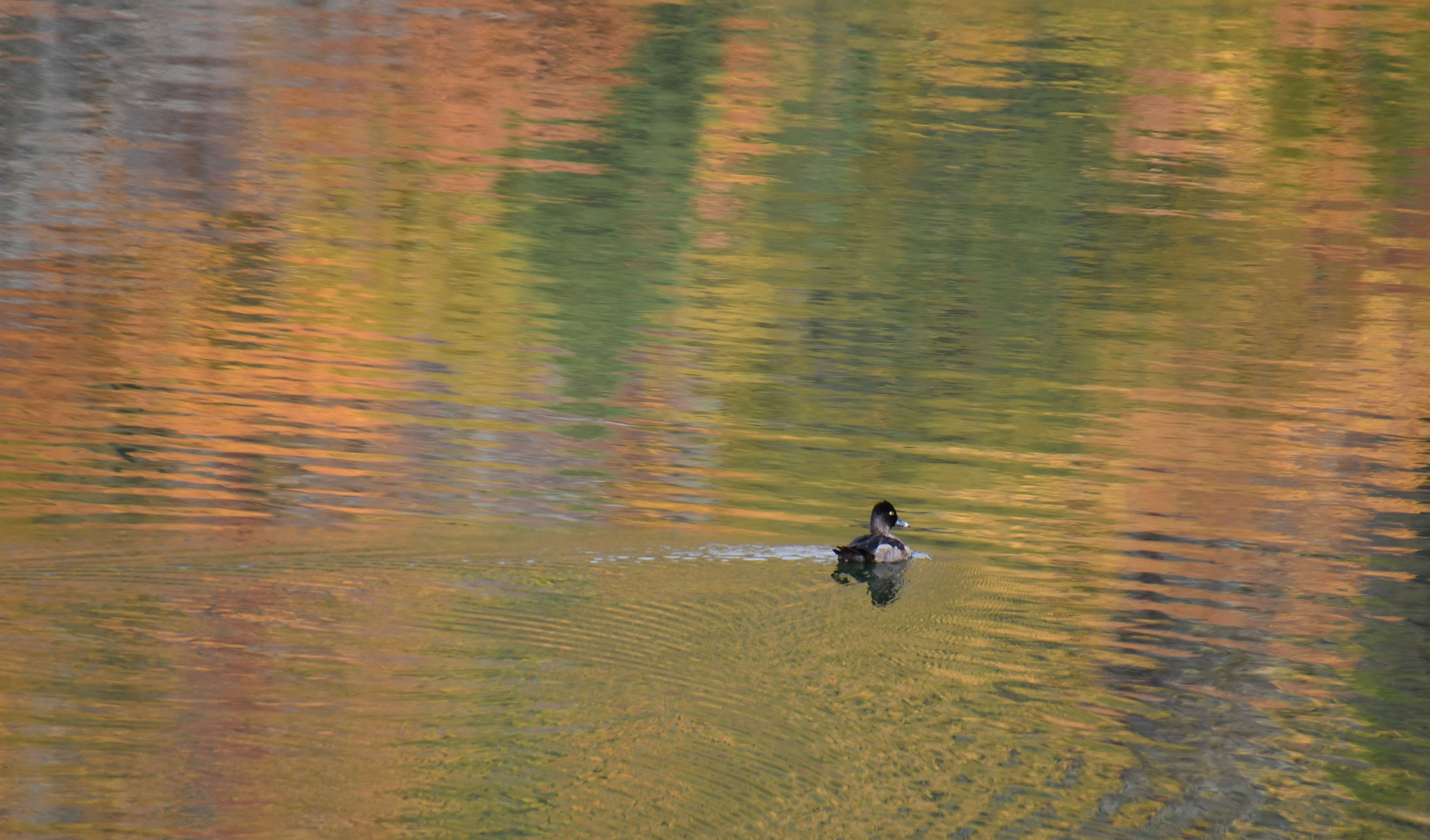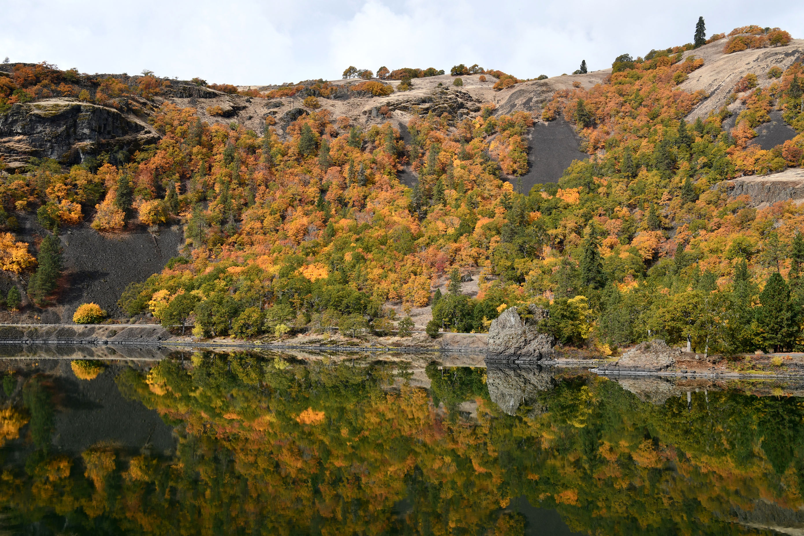 This is near one of my favourite networks of hiking trails, at Coyote Wall.Twice the colour when there are reflections.This black and grey bird is for once part of an explosion of colours. It looks like a Scaup, but with a black back I suppose it is not. Possibly a hybrid duck. Looking across Rowland Lake to a white pickup, where a man emerged with a fishing pole.Reflections of rocks and foliage.Such colour. It was breathtaking.