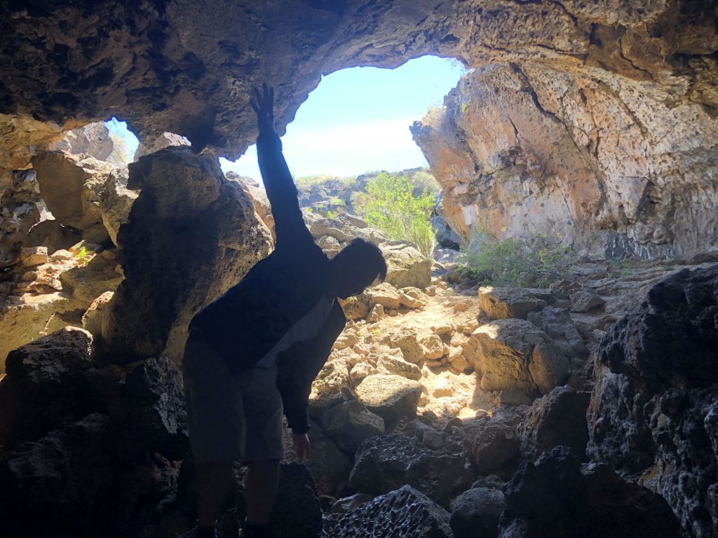 Our next trip was to Southern Oregon for a show and tell of places we both used to live, and to visit blogger friends Curt and Peggy. Here, Pedro is goofing around inside a cave at Lava Beds National Monument.
