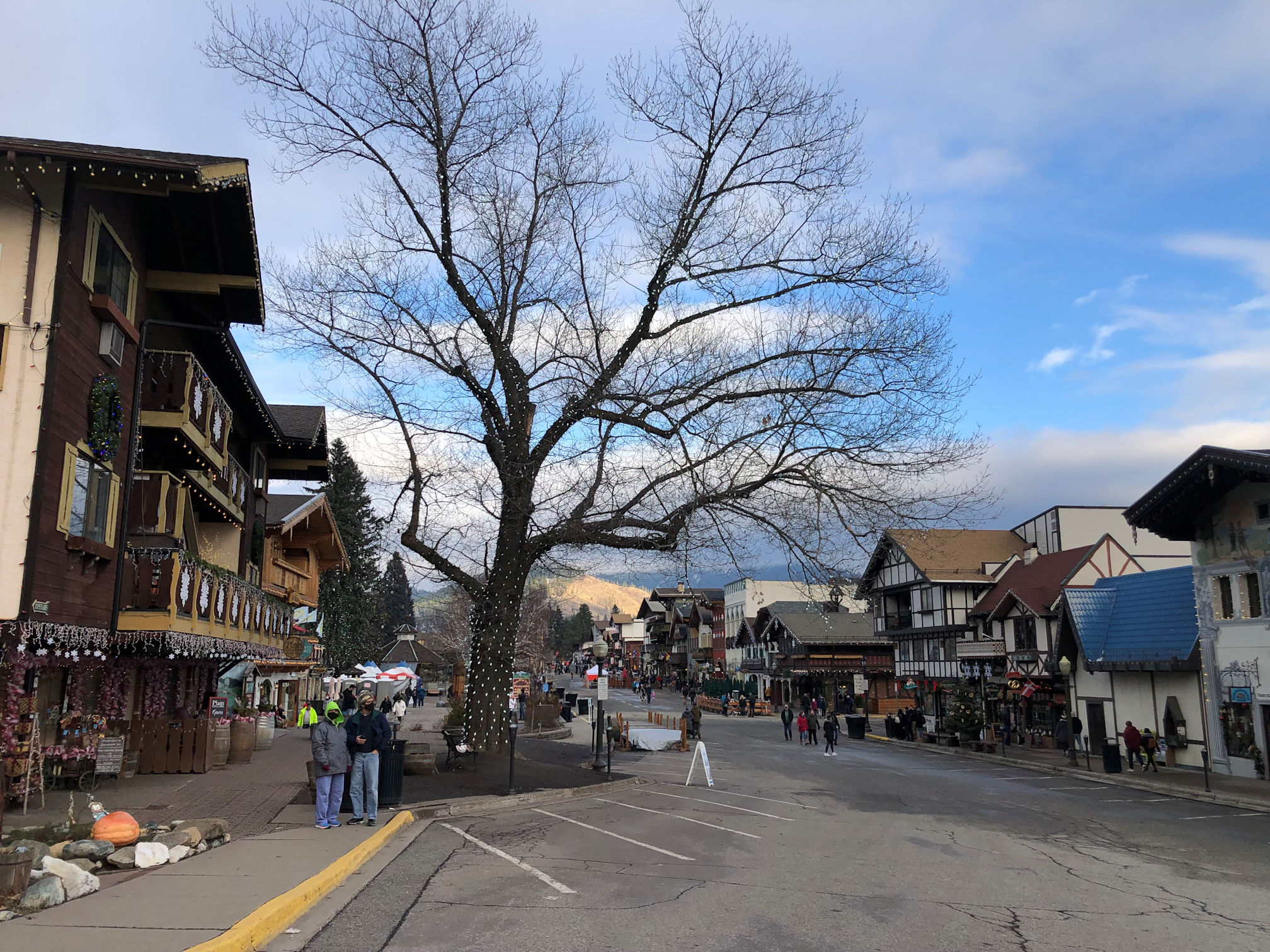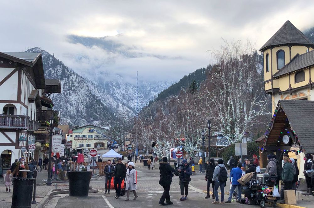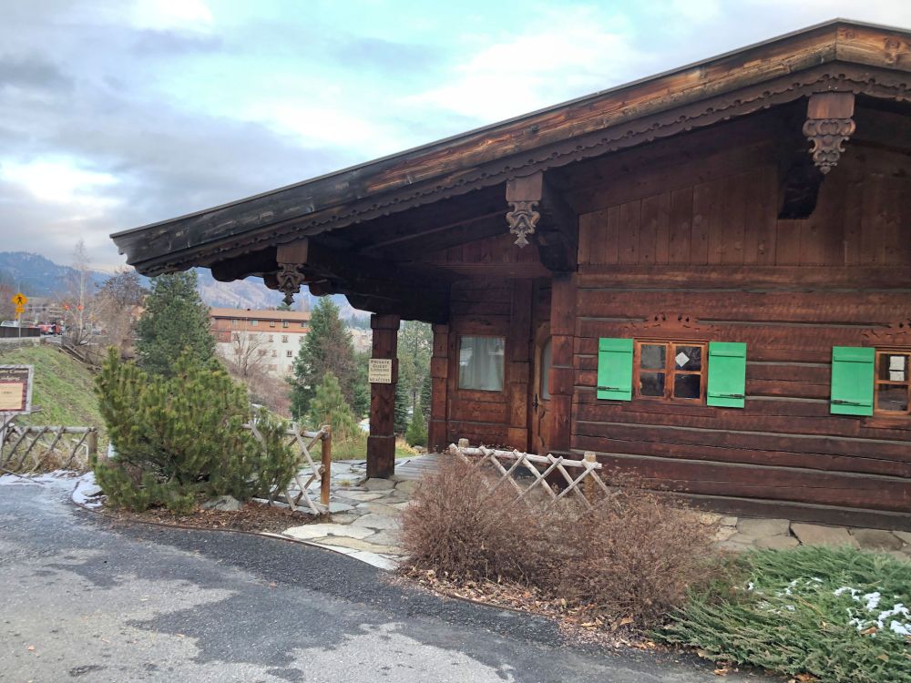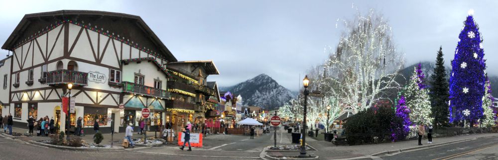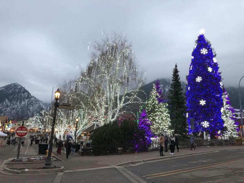 Our plans were to arrive a little before sundown, so that we could go exploring and see the town in daylight, then not have much of a wait to see the town at night. I was looking forward to the Christmas light display. In previous years, Leavenworth had an official lighting ceremony, in which all the lights came on at a particular time each Friday, and stay lit for the weekend, so thousands would show up all at the same time and gather. This is clearly a bad idea during a pandemic. Their current policy is: lights on 24/7. That means people get to see them whenever they show up, and thus the crowds are much smaller. We arrived on a Tuesday and there was no crowd at all.