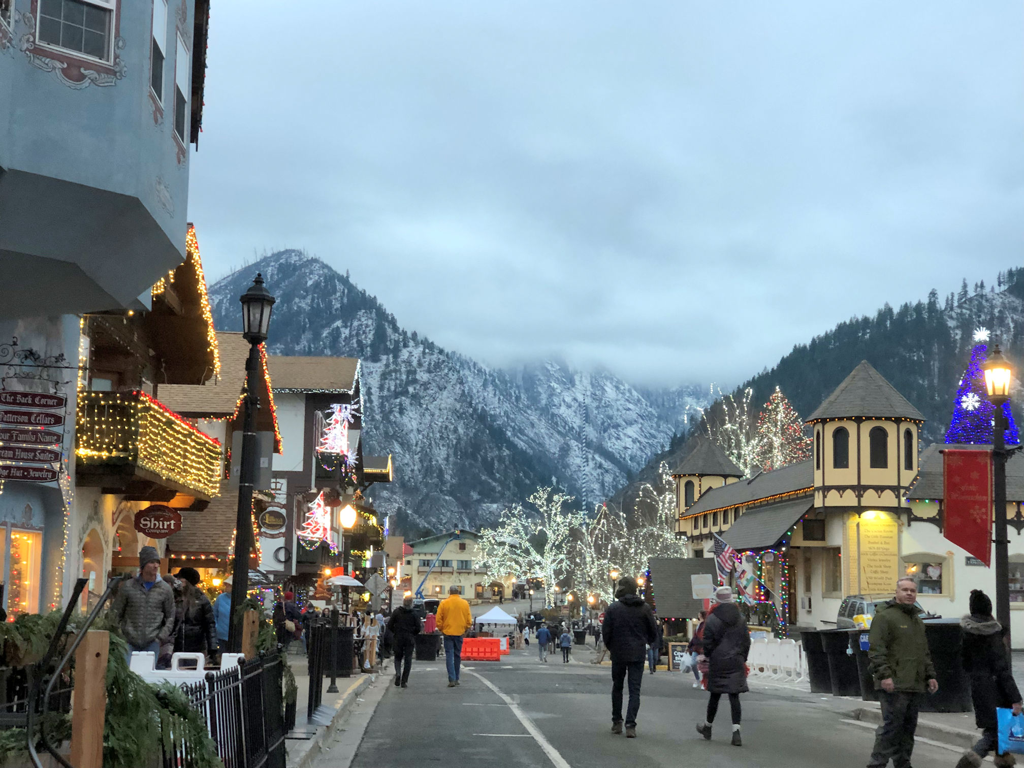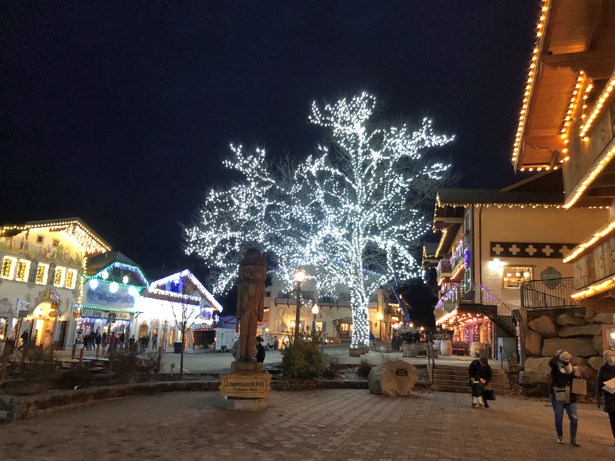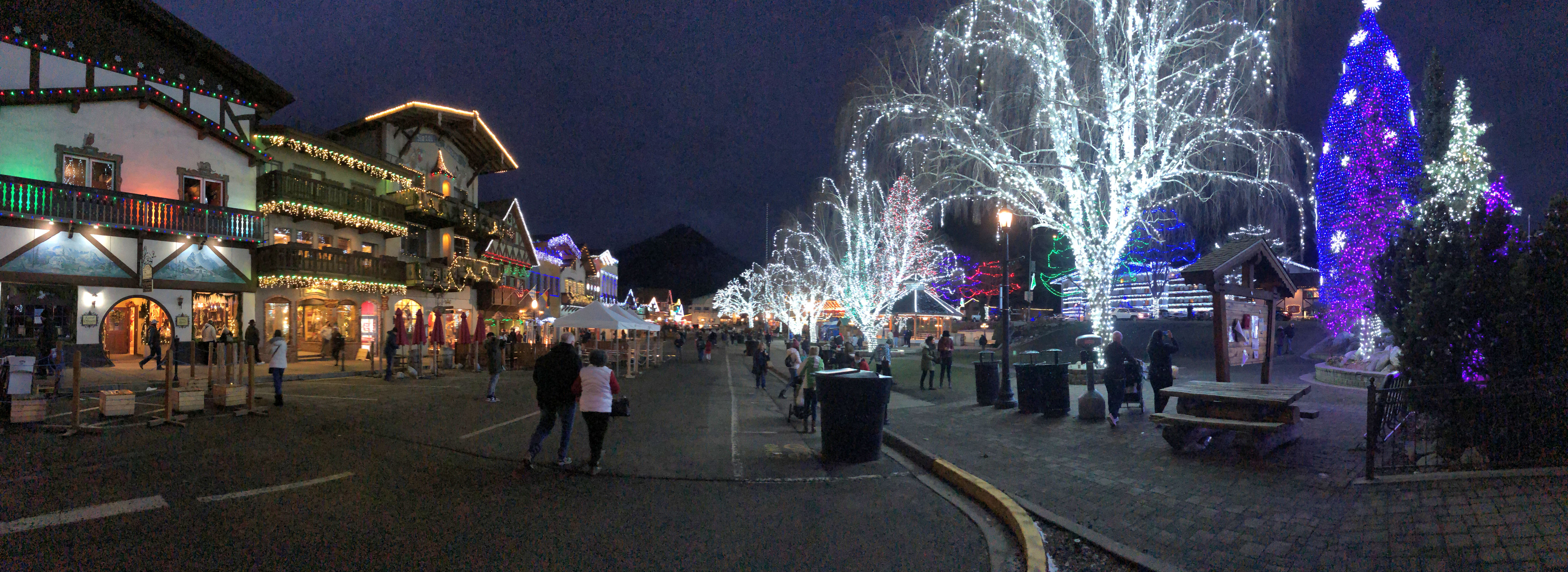 Our plans were to arrive a little before sundown, so that we could go exploring and see the town in daylight, then not have much of a wait to see the town at night. I was looking forward to the Christmas light display. In previous years, Leavenworth had an official lighting ceremony, in which all the lights came on at a particular time each Friday, and stay lit for the weekend, so thousands would show up all at the same time and gather. This is clearly a bad idea during a pandemic. Their current policy is: lights on 24/7. That means people get to see them whenever they show up, and thus the crowds are much smaller. We arrived on a Tuesday and there was no crowd at all.