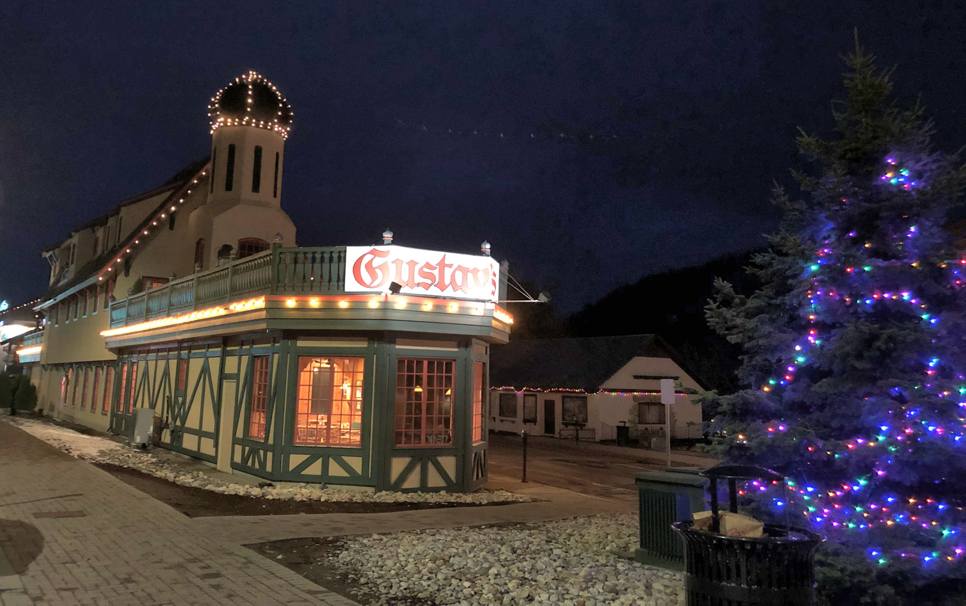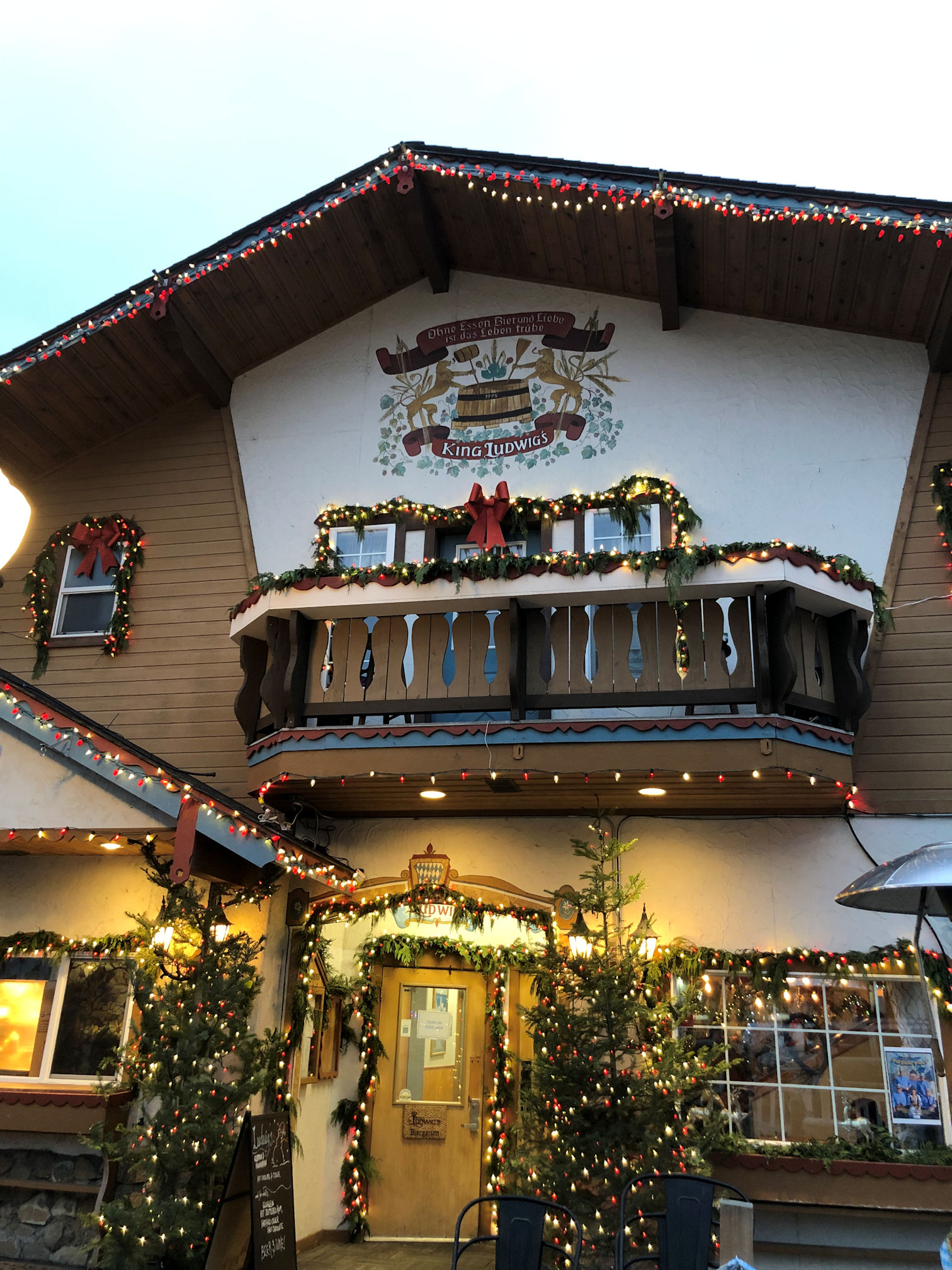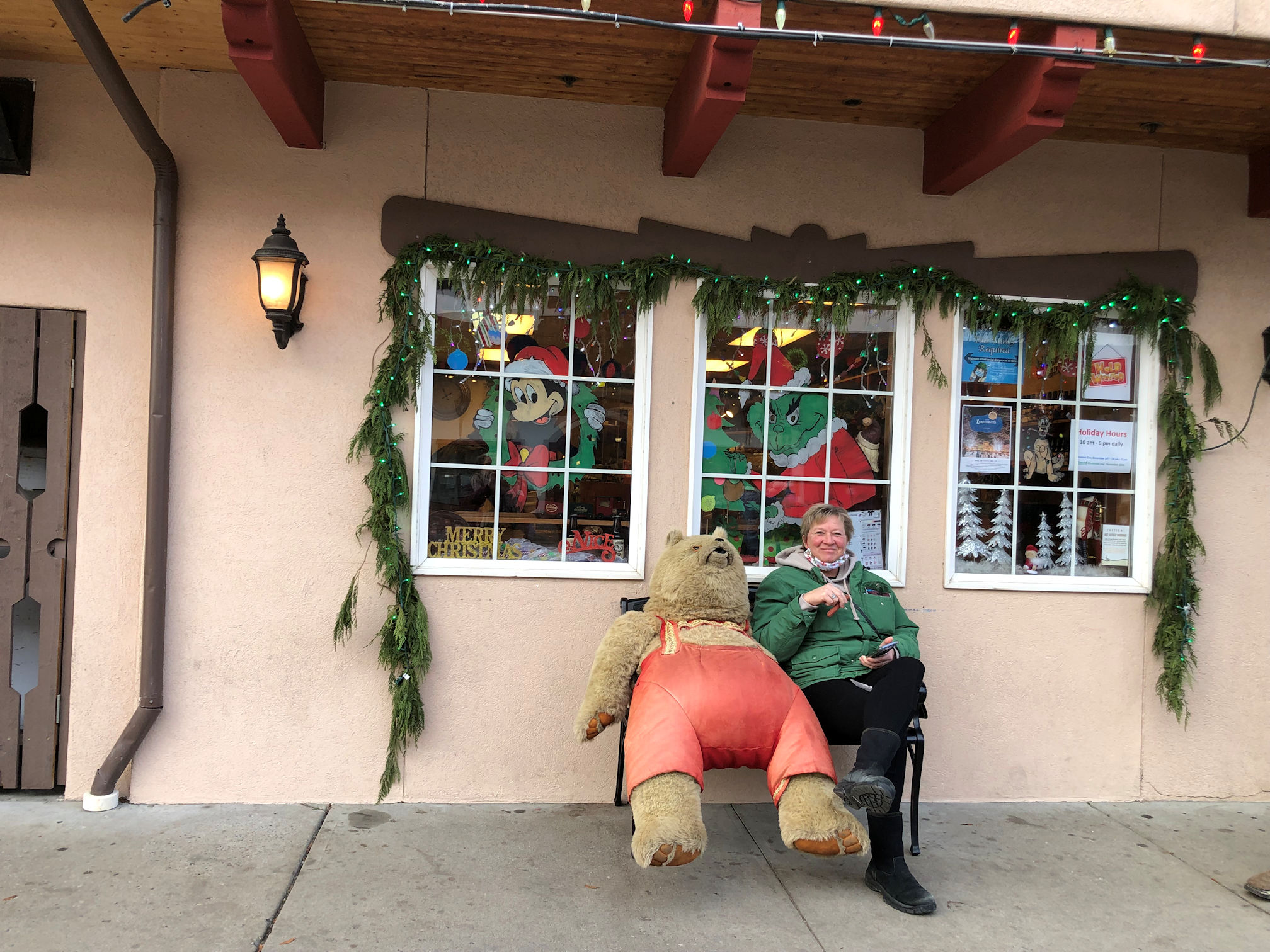 Our plans were to arrive a little before sundown, so that we could go exploring and see the town in daylight, then not have much of a wait to see the town at night. I was looking forward to the Christmas light display. In previous years, Leavenworth had an official lighting ceremony, in which all the lights came on at a particular time each Friday, and stay lit for the weekend, so thousands would show up all at the same time and gather. This is clearly a bad idea during a pandemic. Their current policy is: lights on 24/7. That means people get to see them whenever they show up, and thus the crowds are much smaller. We arrived on a Tuesday and there was no crowd at all.
