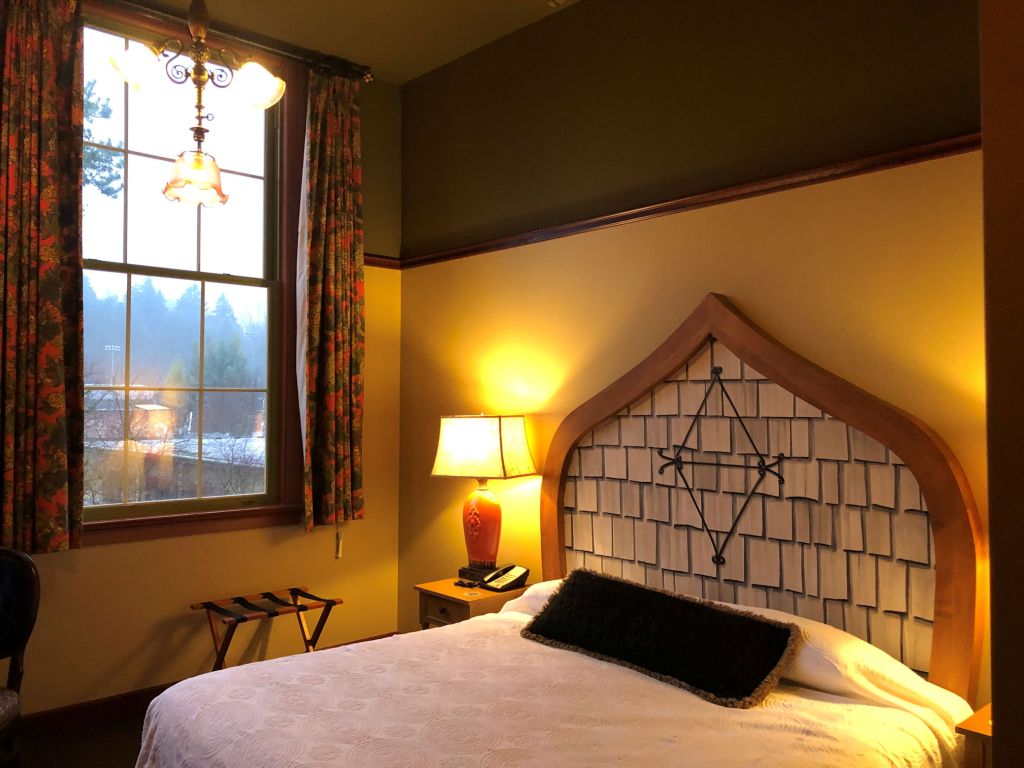 Two characteristics about McMenamins I like the most (other than beer and cider) are: 1) their decor inside and out is fanciful, if not downright crazy. Every single McMenamins facility is adorned with mis-matched antique lighting, stained glass, out-of-this-world paintings, old street signs, historic concert posters and unexpected sculptures. You will be surprised by what you find in the hallways, bathrooms, parking lots, and gardens. The places are designed to delight, and frequently make an extra effort to champion musical history and local history in some way. The other thing is that 2) the properties are often reclaimed historical buildings. I like this because I am a fan of old and interesting architecture. In some cases the campus will be quite large, as with the one we stayed at in Bothell.