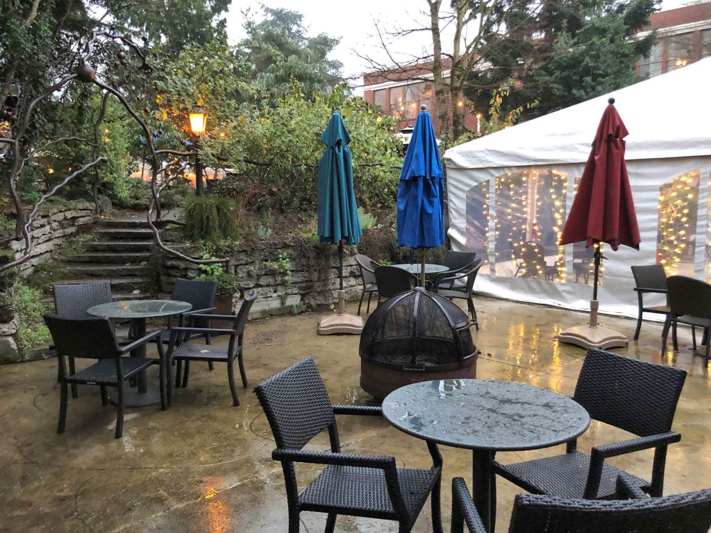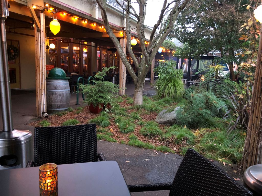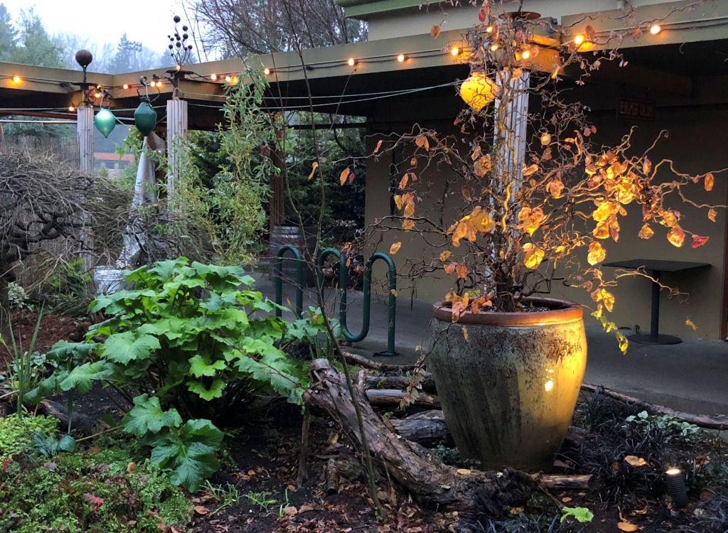 Pedro and I arrived late afternoon on a Monday in December. The place was totally dead, so we had an opportunity to wander around the entire place and explore without bothering anyone. All my photos for this post were taken when the property was nearly deserted, but trust me it was filled with people inside and outside both nights we stayed there. At McMenamin’s hotels, guests are encouraged to poke into every corner, walk on every path, push through doors and peer around corners. I realized, while we were touring the garden, that a benefit of reclaiming a historic site is that the trees can be enormous – something unexpected with a hotel that only opened in 2015. There are beautiful trees in the garden that have been here for many years.