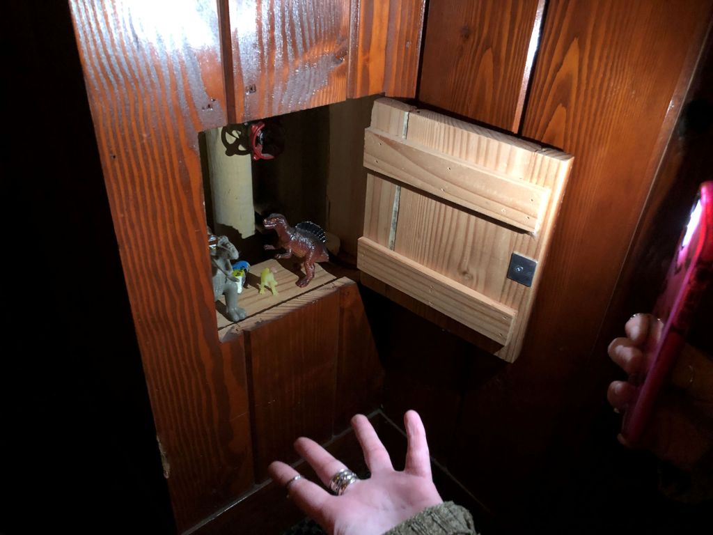 We spent an hour or two exploring the grounds, and trying to solve the riddles to earn stamps in my McMenamins passport. We were disappointed to hear that the theater (in the school’s former gymnasium) was closed on Mondays and Tuesdays – exactly when we would be there, so we couldn’t watch a movie or see the theatre bar. The Principal’s Office was closed and The Shed was closed. *sigh* When we went to the front desk to get stamps, we asked if there was a secret room. Sadly, no, was the answer. But the fabulous person behind the front desk said, “For everyone who asks that specifically, I show them our one very secret room. Follow me.” She shifted a chair, and bent into a corner and pulled open a tiny door with her fingernails.
