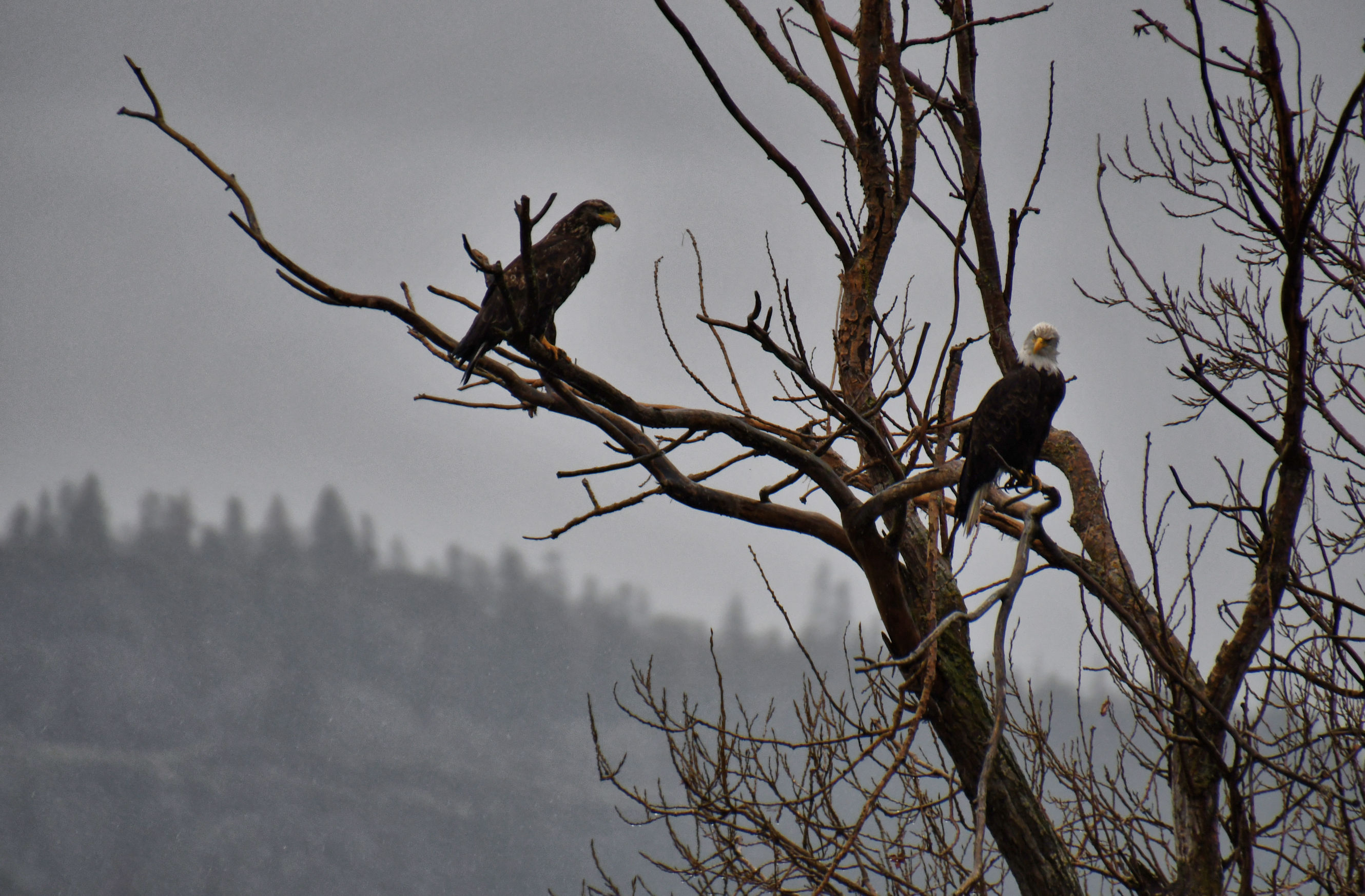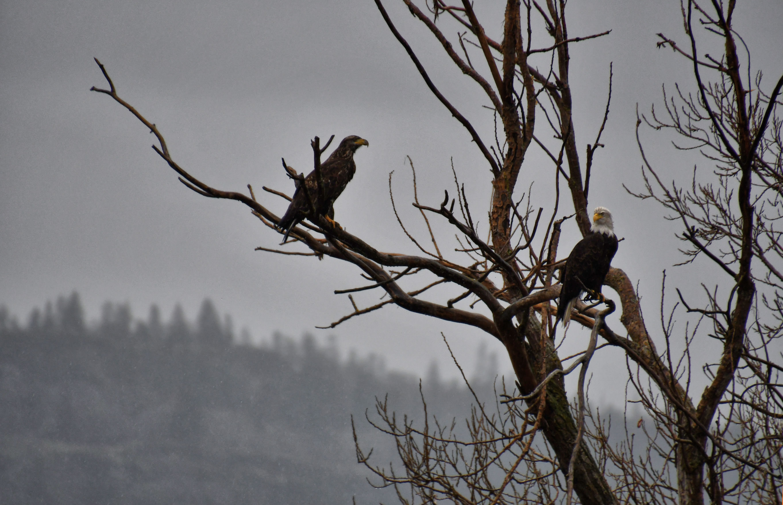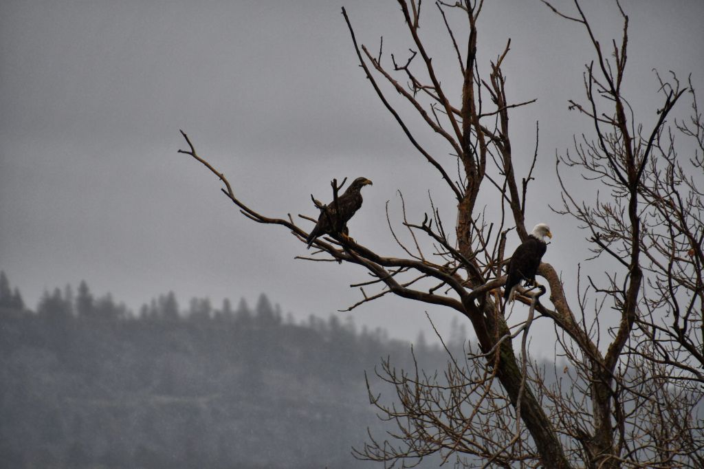 After taking a couple shots of the adult (white head) and juvenile (brown) Bald Eagles in the tree, I adjusted my lens and then brought it up to take more photos. But whoops, they had spotted me and quickly flew away. Thankfully, their flight offered me that awesome shot.